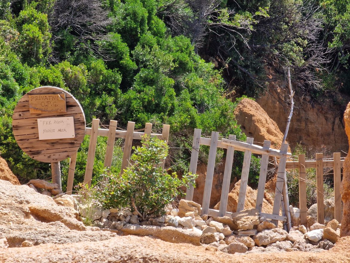 I sin od 4 godine je htio vidjeti što piše na natpisu na onoj ogradi i samo smo se približili na kojih 30-ak metara od te ograde, dakle ne baš pretjerano blizu onoj ograđenoj plaži i onaj dobro znani opjevani pacijent je počeo nedefinirano vikati na nas i lamatat rukama ko čimpanza. Uglavnon, nismo ni išli dalje, viknuo san mu nešto tipa "neka dođe dolje ako je frajer". I to je bilo to, ni glasa više, ostali smo na toj plažici cijeli dan. Nama više nisu, ali u nekoliko sati, koliko smo bili tamo, on i njegova žena urlali su tako na dvadesetak ljudi. I to se apsolutno nitko nije približio ni na 50 metri od "njegove" plaže.