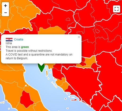 Klikom na Istru otvara se prozorčić u kojem piše da je u to područje dozvoljeno putovanje bez ikakvih ograničenja. Također, navodi se da po povratku u Belgiju ne treba imati negativan covid-test te niti ići u 14-dnevnu samoizolaciju, odnosno karantenu, prenosi Index.