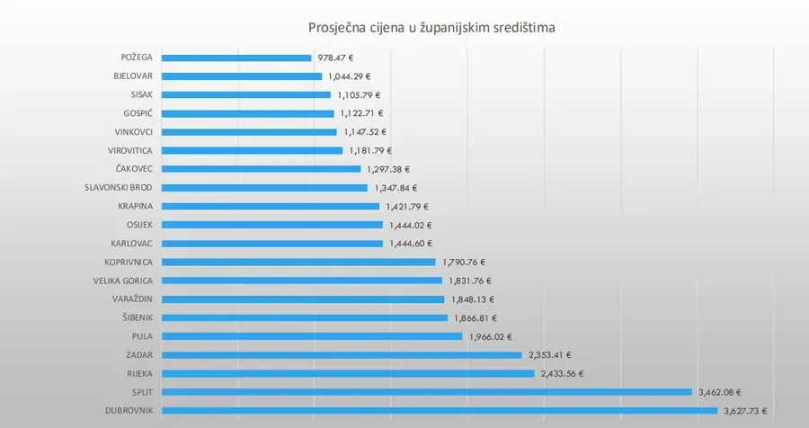 U njima se može vidjeti da je prosječna cijena kvadrata najjeftinija u Požegi (978,47 eura), a najskuplja u Dubrovniku (3627,73 eura). Od većih gradova, u Splitu je prosjek 3462,08 eura i po tome je drugi najskuplji grad u Hrvatskoj za kupovinu stana. Slijedi Rijeka s prosječnom cijenom 2433,56 eura, a Osijek je na osjetno nižih 1444,02 eura. Primjerice, skuplje je kupiti nekretninu u Karlovcu (1444,6 eura), Velikoj Gorici (1831,76 eura) ili Šibeniku (1866,81 eura).