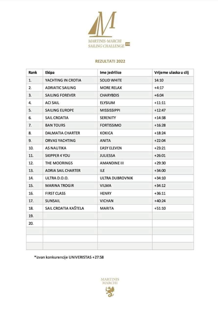 Najbolja mala marina u Hrvatskoj, kako je proglašena na ovogodišnjim Danima hrvatskog turizma, tradicionalno zatvara ovogodišnju uspješnu sezonu uz zanimljiv jedriličarski izazov, Sailing Challenge. Svake godine Martinis Marchi okuplja brojne predstavnike charter tvrtki i agencija, predstavnike marina, čelnike s otoka Šolte te ostale uzvanike i drage prijatelje, kako bi im zahvalili na odličnoj suradnji u turističkoj sezoni.