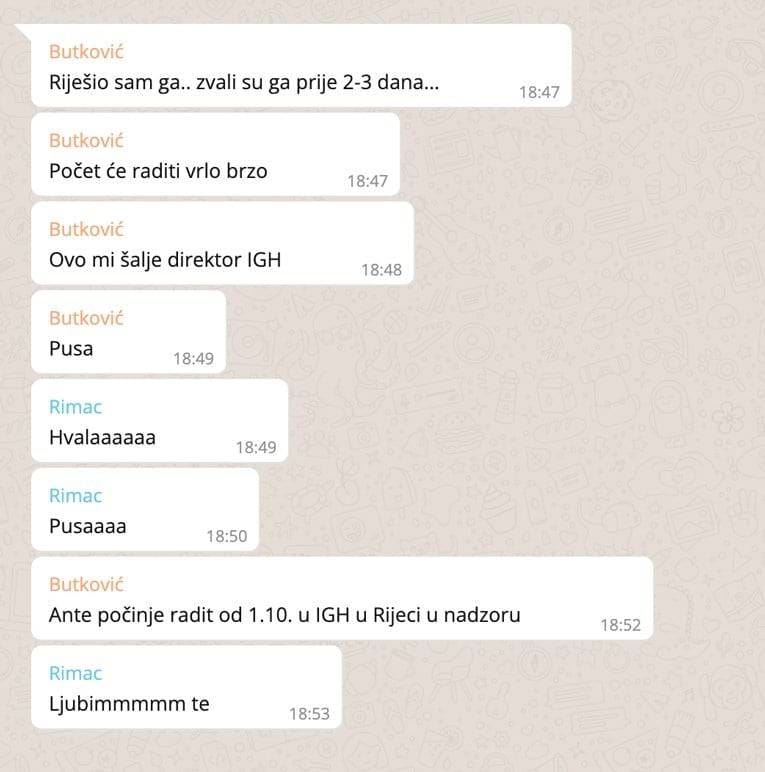 U srpnju 2019. Rimac je tražila Butkovića da "provjeri još je s onim malim". U rujnu 2019. poslao joj je: "Riješio sam ga, zvat će ga za dva tri dana", te "Ante počinje raditi 1.10. u Rijeci u nadzoru".