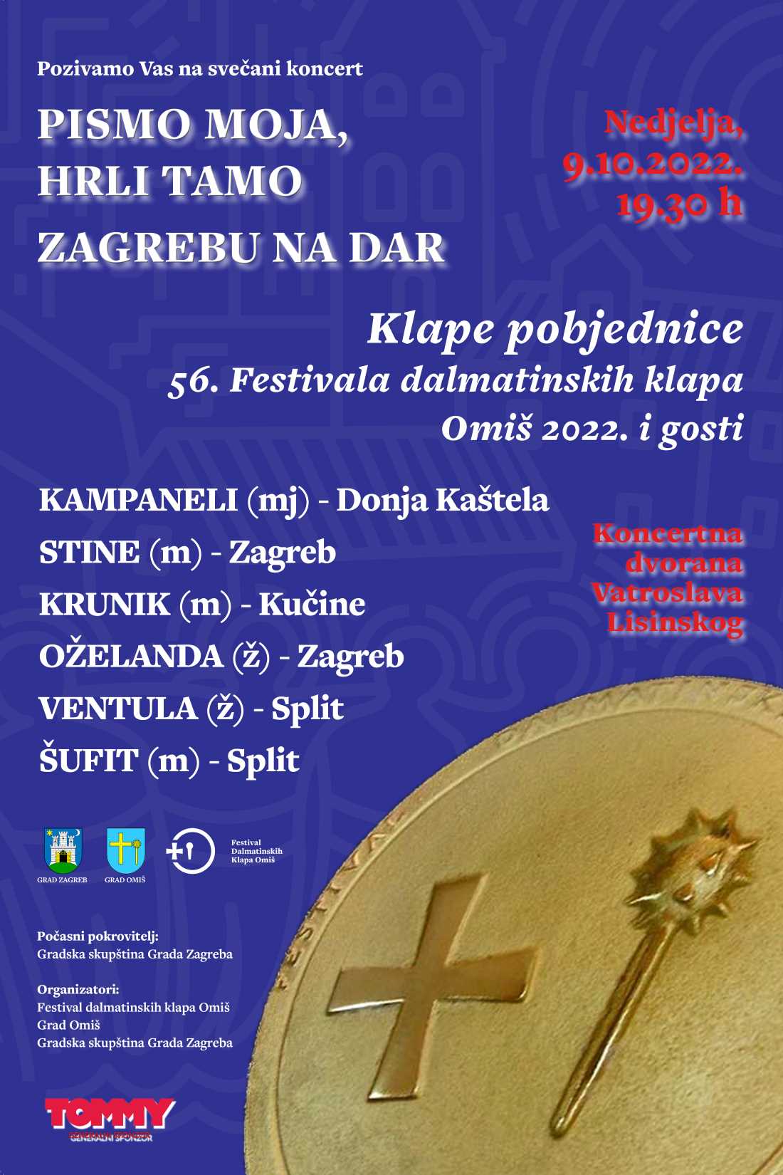 Tradicionalna gostovanja najboljih klapa u Lisinskom pridonose učvršćivanju odnosa između Zagreba i Omiša, te suradnji koja je postala simbolom zajedništva sjevera i juga Hrvatske. Stoga Vas pozivamo da nam se pridružite u nedjelju 9. listopada u 19.30 sati na 36. svečanom koncertu „Pismo moja, hrli tamo - Zagrebu na dar“.
