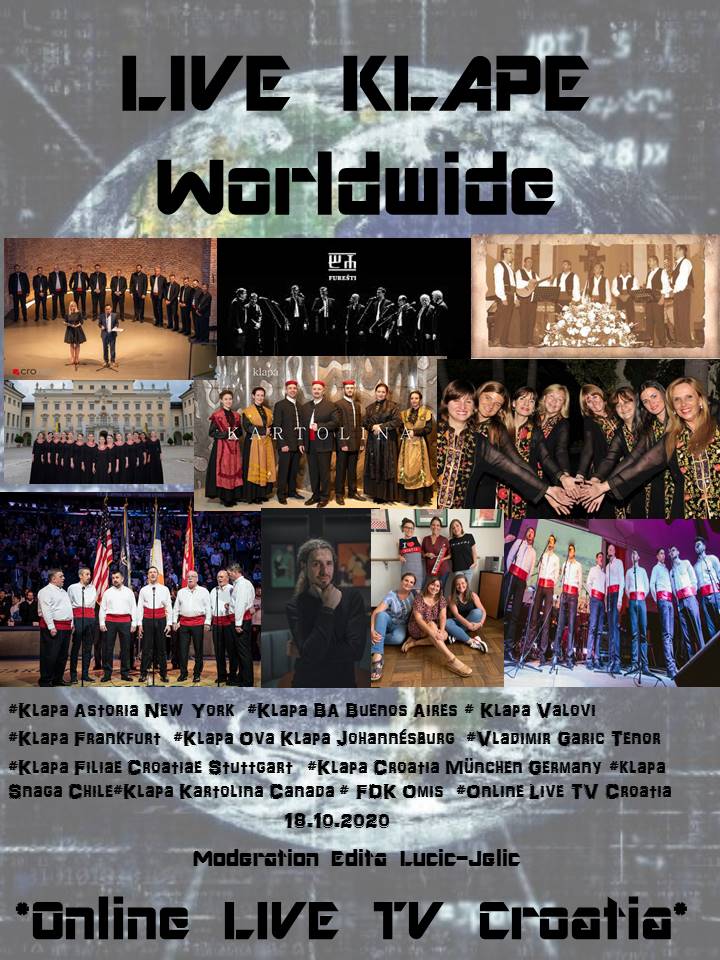 Jeste li ikada prije vidjeli televizijsku emisiju u kojoj uživo gostuje deset dalmatinskih klapa sa četiri kontinenta? Taj jedinstveni klapski događaj možete pogledati ove nedjelje u 15.00 sati po hrvatskom vremenu, u programu Online LIVE TV Croatia.