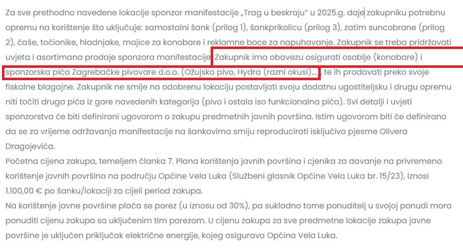Naime, u Javnom pozivu za zakup javne površine za postavljanje šankova za vrijeme održavanja manifestacije „Trag u beskraju“ u 2025.g., koja je objavljena OVDJE, načelnica općine Katarina Gugić jasno uvjetuje da "zakupnik ima obavezu osigurati osoblje (konobare) i sponzorska pića Zagrebačke pivovare d.o.o. (Ožujsko pivo, Hydra (razni okusi)...), te ih prodavati preko svoje fiskalne blagajne. Zakupnik ne smije na odobrenu lokaciju postavljati svoju dodatnu ugostiteljsku i drugu opremu niti točiti druga pića iz gore navedenih kategorija (pivo i ostala iso funkcionalna pića)."
