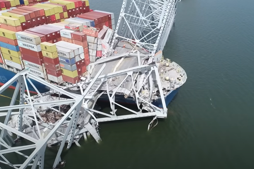 Fotografije koje je ustupila policija okruga Baltimore pokazuju velike kranove koji su pozicionirani kod pramca broda spremni da s nasukanog broda uklone nasukani teret.