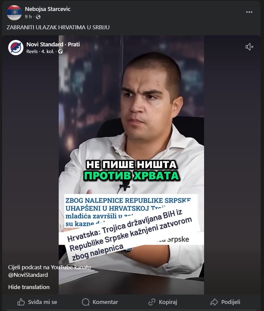 Starčević se naime redovito ruga teritorijalnom integritetu, Ustavu i zakonima Republike Hrvatske, zaziva propalu tzv. krajinu i tzv. veliku srbiju te u tome uporno ustraje. Da se radi o opasnoj osobi, govori i činjenica da često dolazi u Hrvatsku kako bi veličao pobijeđenu ideologiju.
