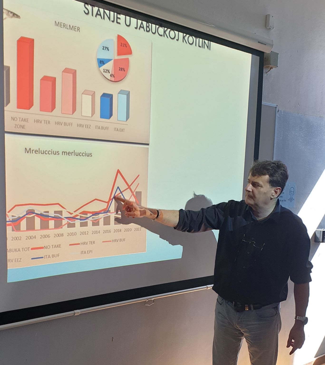 Na prvom školskom panelu dr. sc. Nedo Vrgoč pomoćnik ravnateljice Instituta za oceanografiju i ribarstvo učenicima je prezentirao utjecaj ribolova na biološku raznolikost, značaj Jabučke kotline i provedbe mjera zaštite, aktualno stanje populacija ovog mrjestilišta i rastilišta gospodarski važnijih vrsta uz osvrt na međunarodnu znanstvenu suradnju i suradnje Instituta sa ribarima.