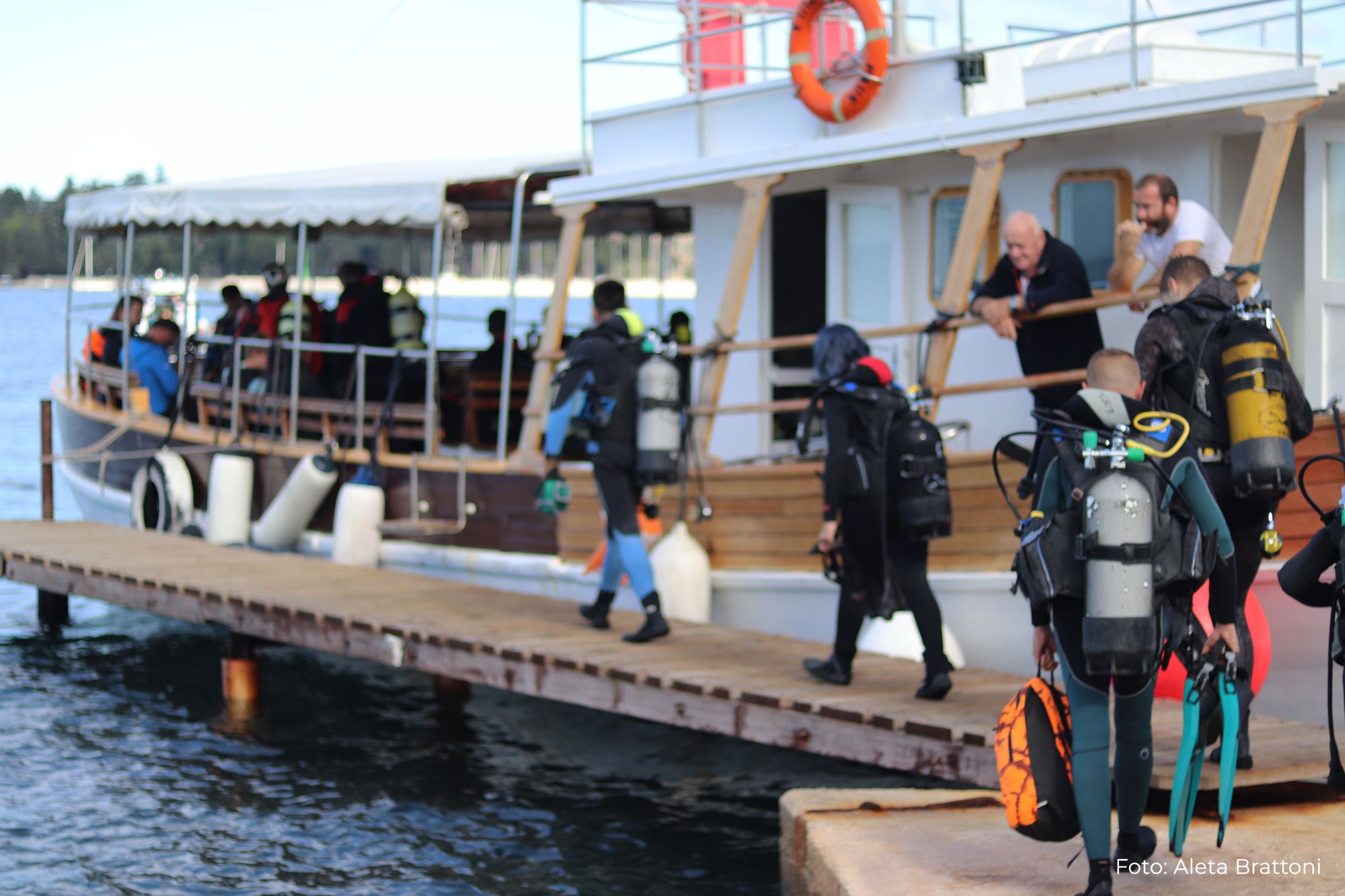 Nakon jutarnjeg briefinga krenulo se nautičku milju od sjedišta Kluba, gdje se smjestio Banjol, otočić impresivne flore i faune s čak tri podvodne spilje, na kojem je još 2017. godine, na oko 14 metara dubine, postavljen brončani kip rovinjske mučenice kojeg je izradio sugrađanin Andrija Milovan.