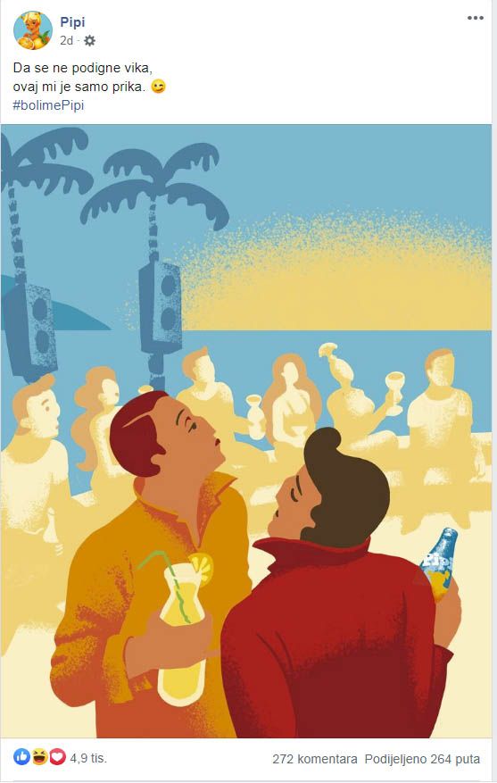 Splitska firma Dalmacijavino nastavlja s kampanjom za svoje najpoznatije bezalkoholno piše Pipi. Na društvenim mrežama objavili su ovih dana novu sliku koja prikazuje dvojicu muškaraca u baru, podignutih kragni, dok jedan pije koktel, a drugi, naravno, Pipi.