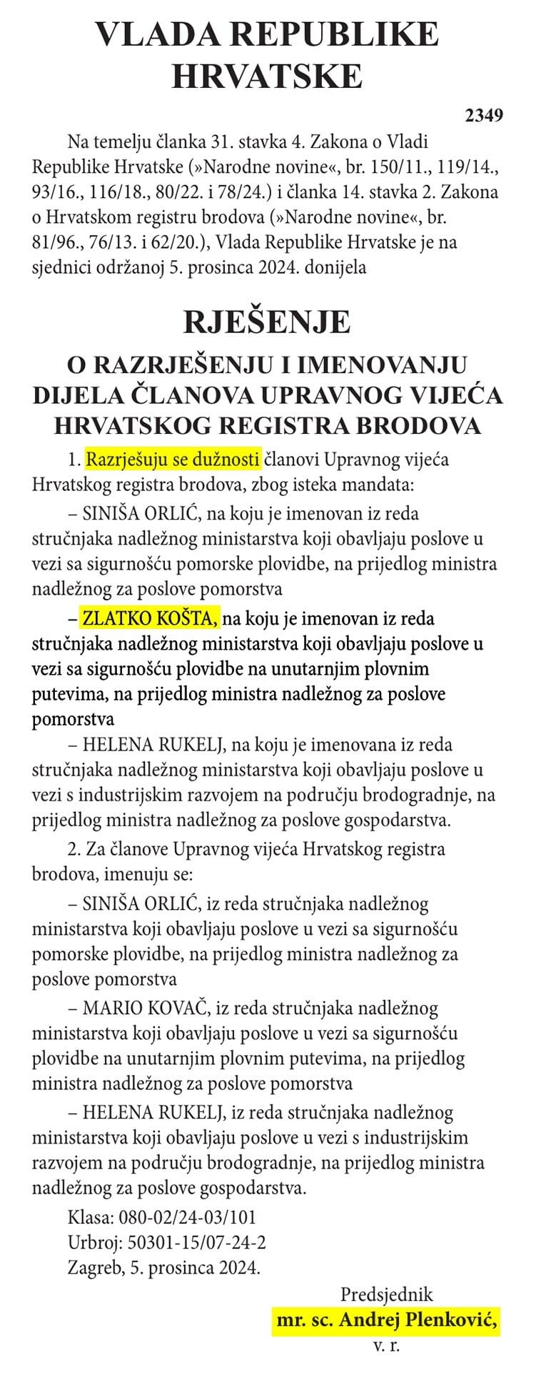 "Imenovanje novih članova Upravnog vijeća Hrvatskog registra brodova provedeno je po isteku mandata dosadašnjeg Upravnog vijeća", odgovorili su iz Ministarstva bez obrazloženja zašto su u Upravnom vijeću ostali Rukelj i Orlić, kojima je također istekao mandat, a Košta nije.