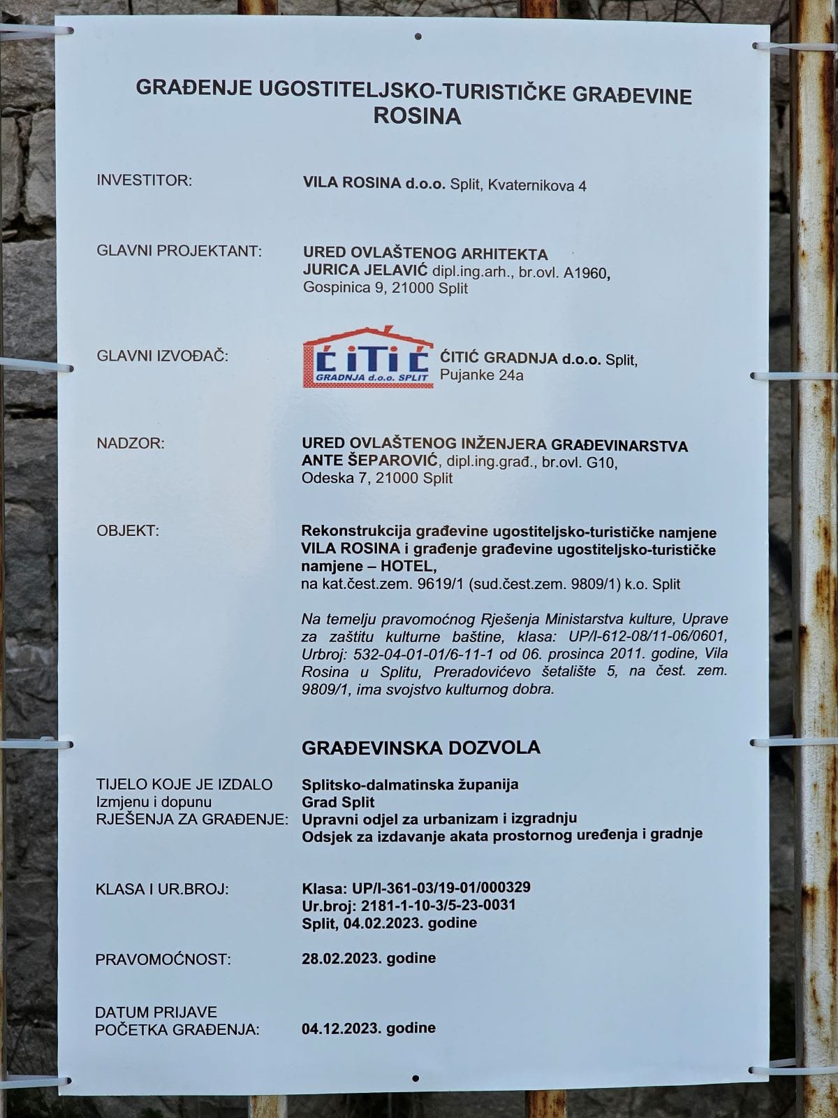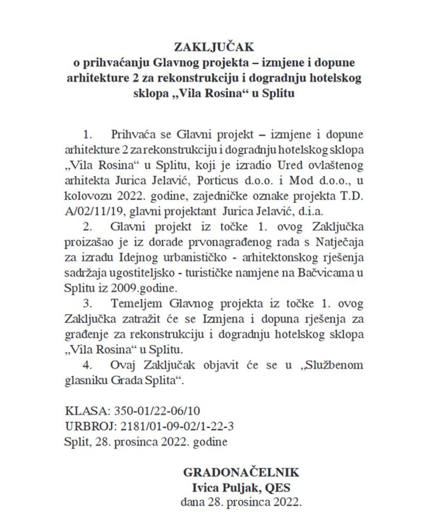 Mamić se prethodno javno bunio kako u Splitu ne može dobiti dozvole za svoje gradnje, no splitski gradonačelnik Ivica Puljak je 28. prosinca 2022., potpisao “Zaključak o prihvaćanju Glavnog projekta – izmjene i dopune arhitekture 2 za rekonstrukciju i dogradnju hotelskog sklopa ‘Villa Rosina’ u Splitu”.
