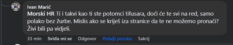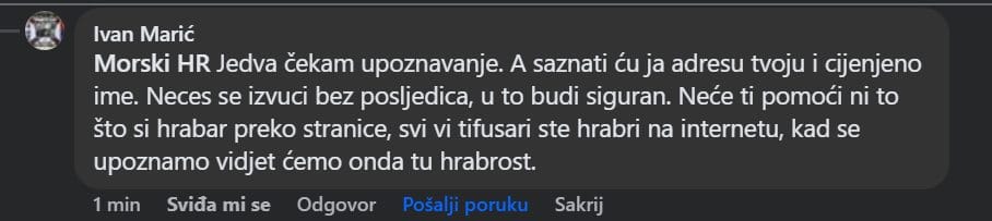 "Morski HR, Jedva čekam upoznavanje. A saznati ću ja adresu tvoju i cijenjeno ime. Nećeš se izvući bez posljedica, u to budi siguran. Neće ti pomoći ni to što si hrabar preko stranice, svi vi tifusari ste hrabri na internetu, kad se upoznamo vidjet ćemo onda tu hrabrost"