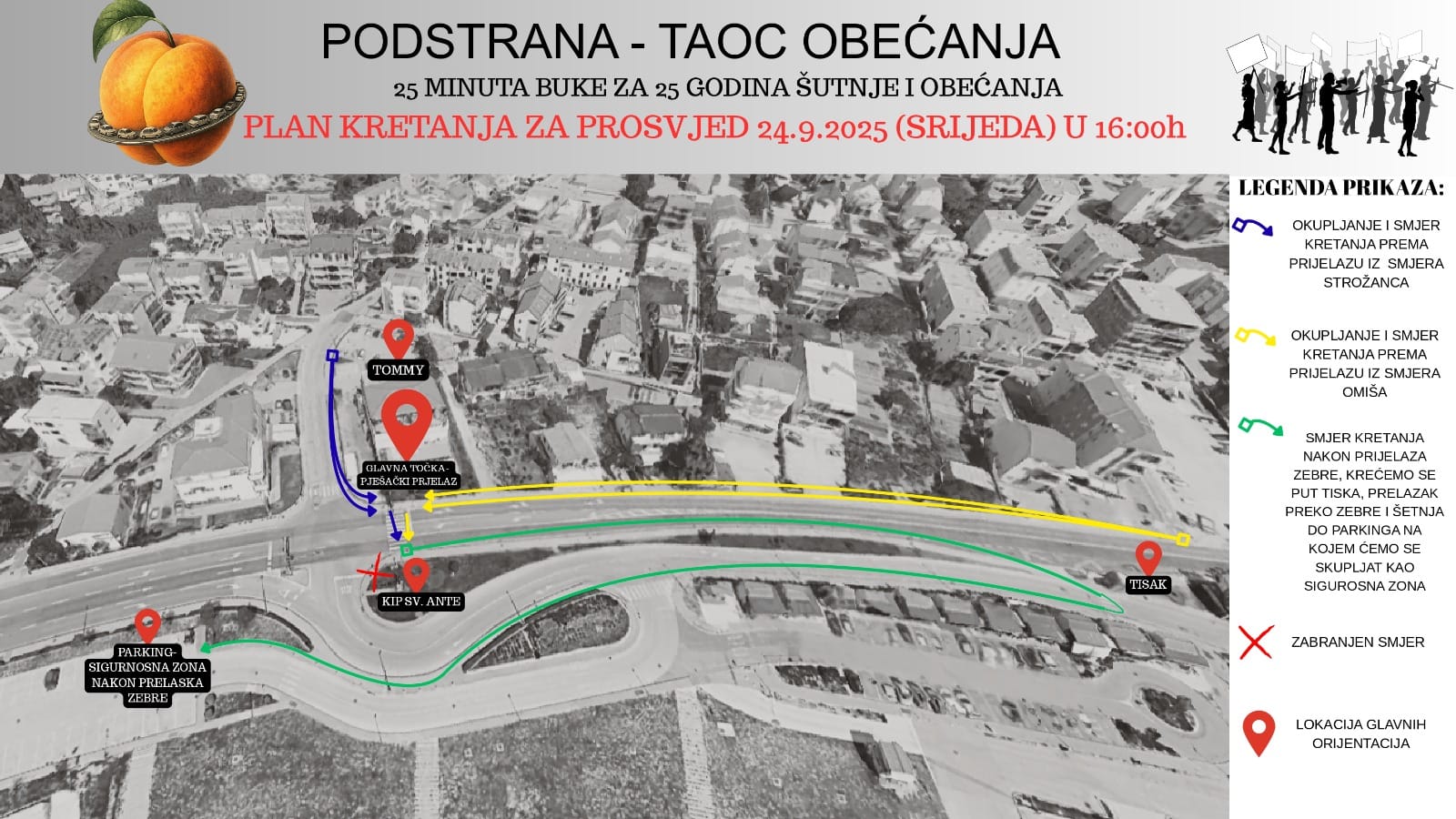 Okupljamo se na nogostupu u koloni oko Tommya, kako je prikazano u planu kretanja. Na znak voditelja prosvjeda redari će prvo zatvoriti pješački prijelaz, a kolona će krenuti skretanjem prema Tisku i uputiti se na veliki javni parking u Strožancu, koji je predviđen kao sigurnosna zona. Tamo ćemo također nastaviti sa zviždaljkama i s visoko podignutim transparentima.