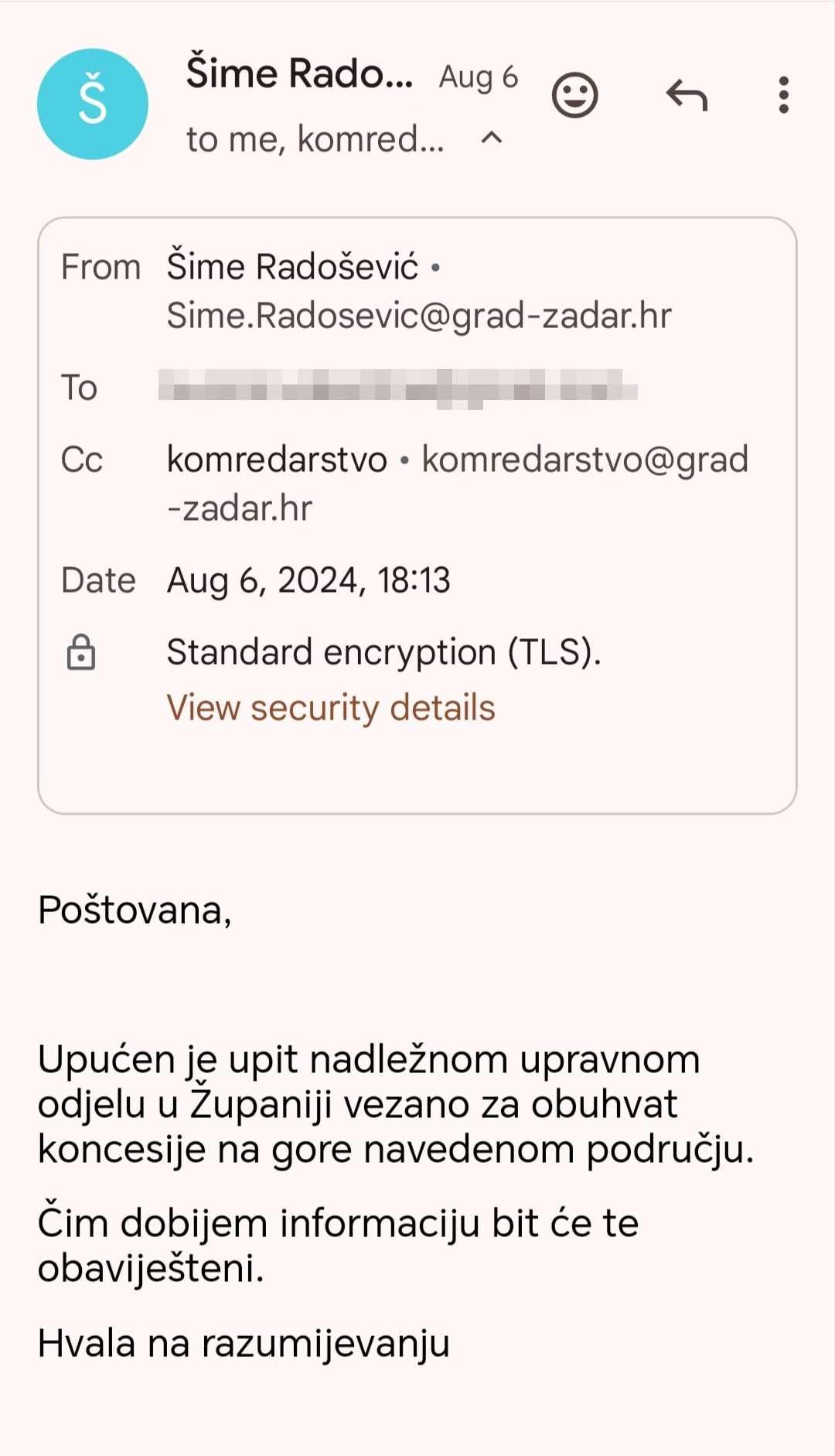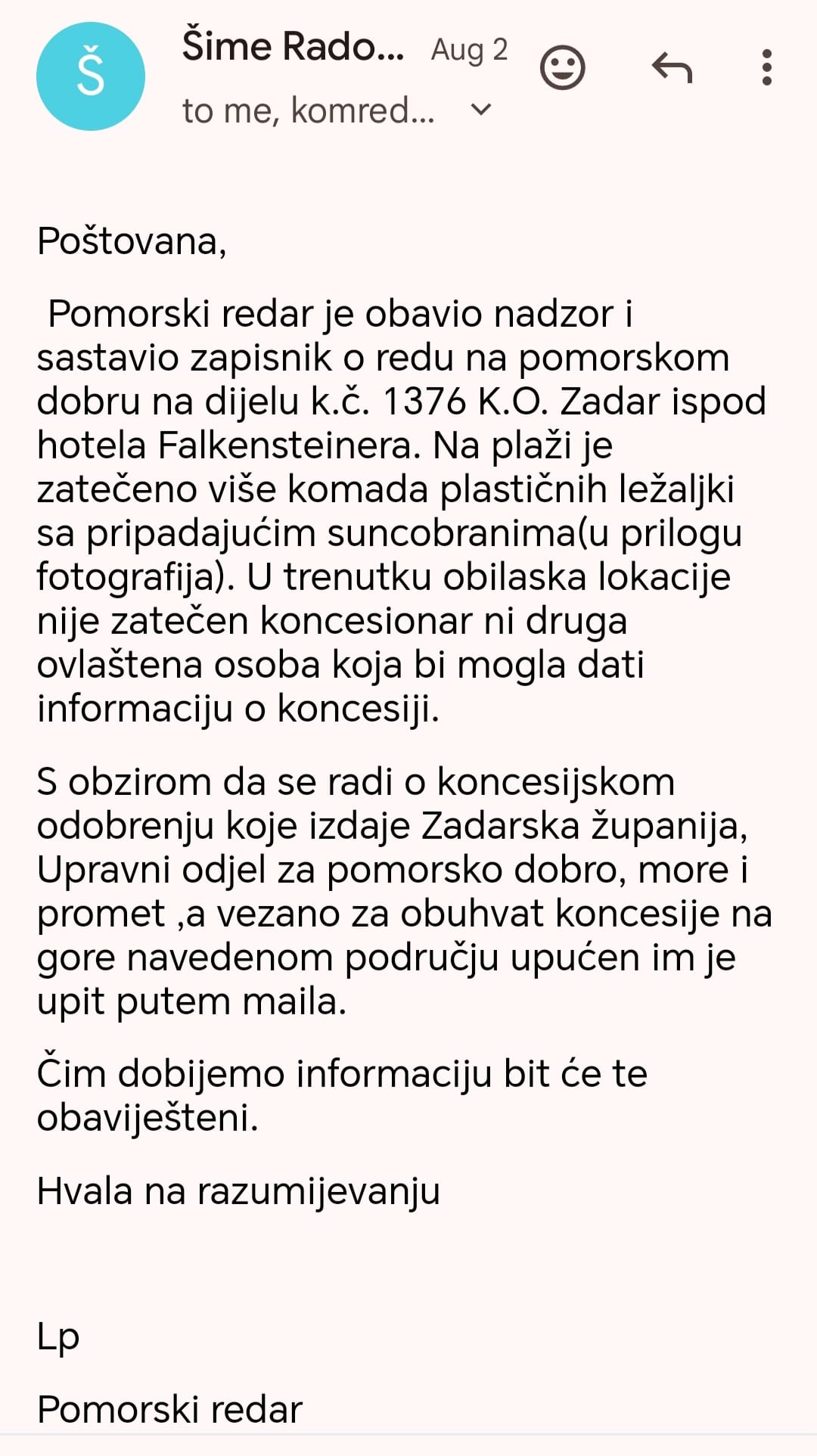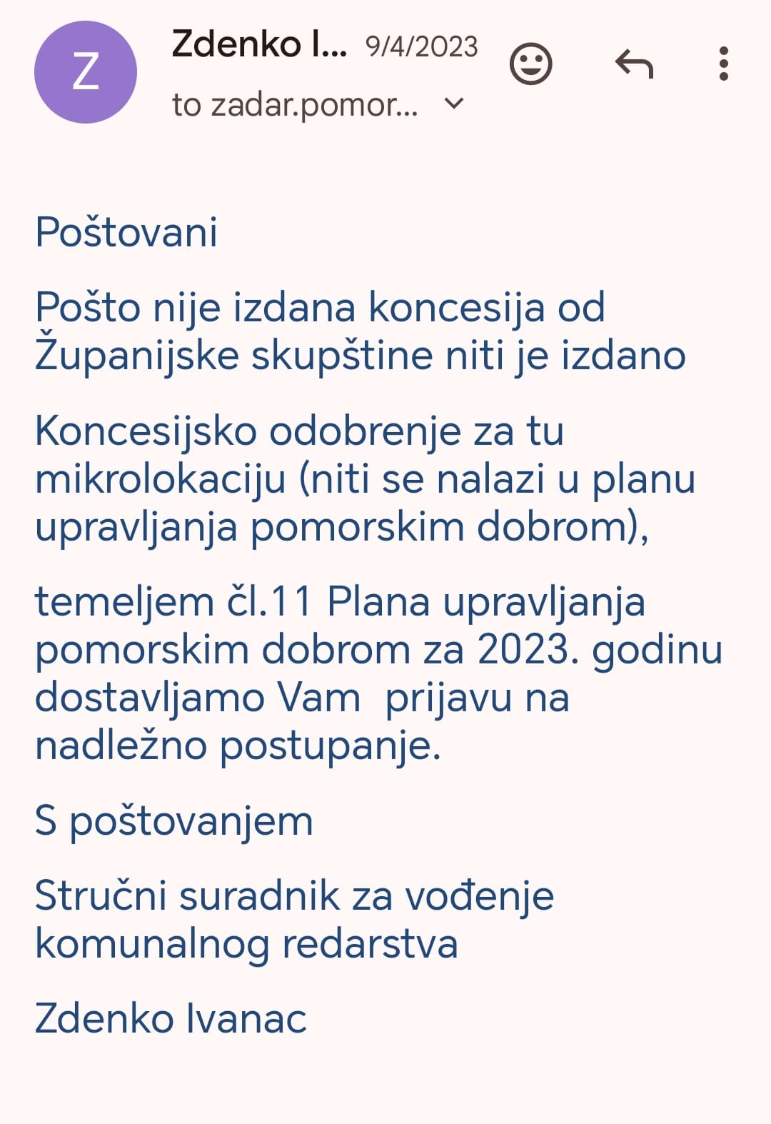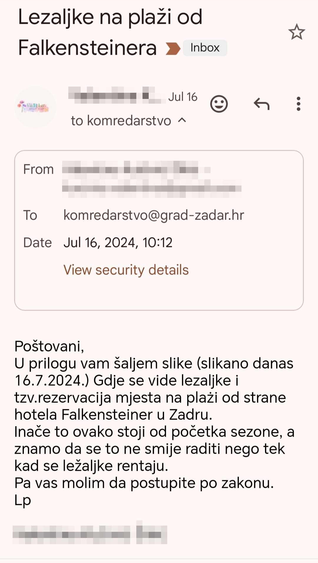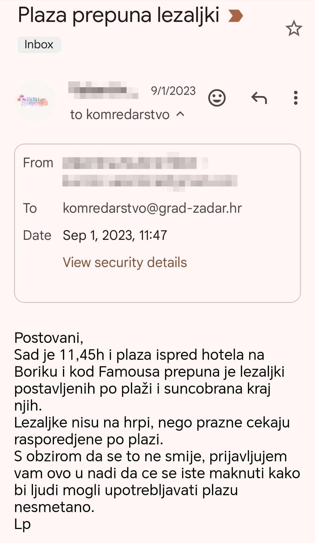 - Prijava komunalnom redarstvu grada Zadra išla je 2023. I ponovno 2024. Komunikacija sa njima je odlična i brza, no očito da se netko iz Grada u cijelom procesu prijave oglušuje na slovo zakona pa dok prođe prođe. Priča je stara i dobro poznata, a u prilogu vam šaljem slike iz 2023, 2024. Kao i komunikaciju mejlom - zaključuje čitateljica.