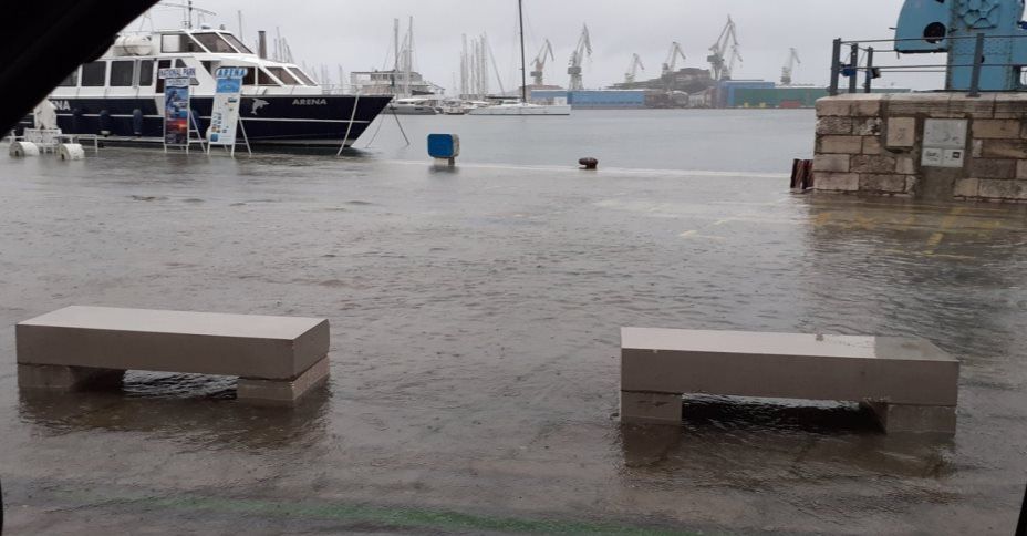 Na pulskoj rivi automobili plivaju, a more se podiglo u razinu s rivom, koju na nekim mjestima prelijeva.