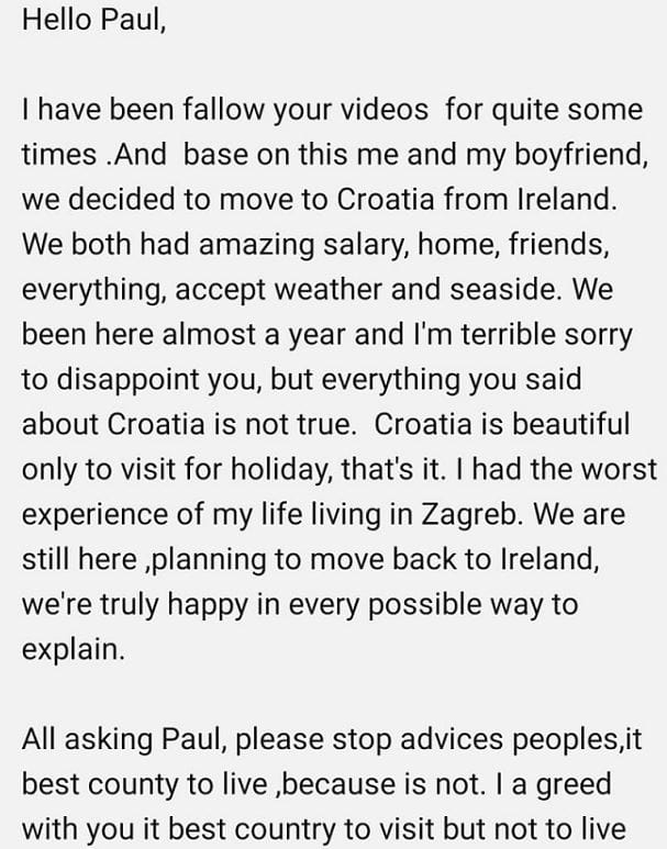 Iskreno sam fasciniran ovim - netko tko je imao sve u Irskoj, osim klime i mora, ali se odlučio preseliti u Hrvatsku nakon što je pogledao nekoliko Braddersovih videa, a onda se razočarao preselivši se u onaj dobro poznato sunshine beach resort u Zagrebu... - završava Bradbury i objavljuje poruku razočarane djevojke koja mu je pisala.