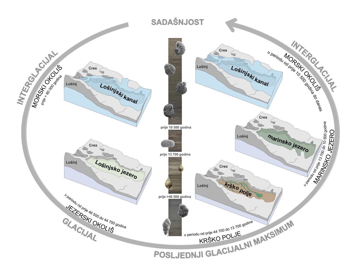Značajnijim porastom razine mora prije ̴ 10 500 godina došlo je do njegovog potpunog poplavljivanja morem i nastanka Lošinjskoga kanala. Time su nekadašnja mora, jezera i rijeke ostali zatrpani duboko ispod današnjeg morskog dna i izvrstan su dokaz paleookolišnih promjena koje su se dogodile na ovom prostoru.