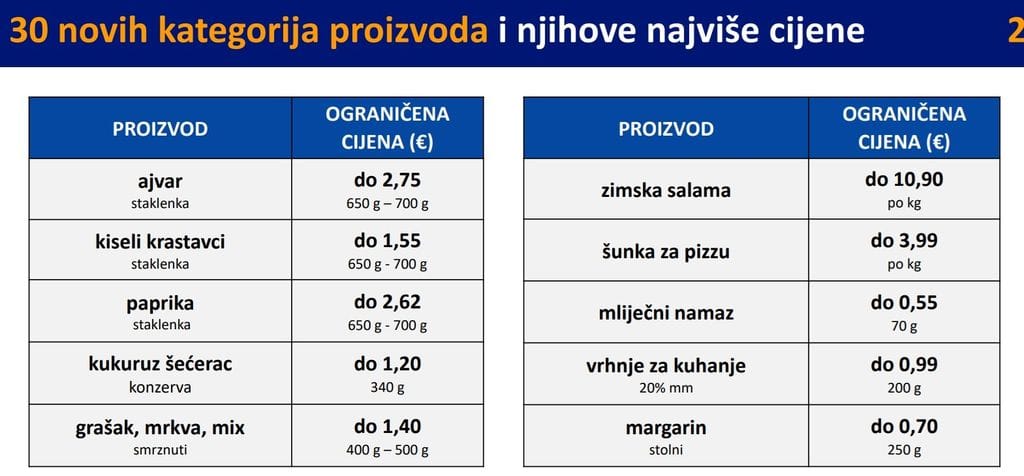 "Novom odlukom obuhvaćeno je 30 proizvoda, za koje su trgovci dužni ograničiti cijenu svih artikala koje imaju u svom asortimanu. Za ostalu 71 kategoriju proizvoda trgovci su dužni osigurati najmanje jedan artikl iz kategorije po ograničenoj cijeni i odrediti najvišu maloprodajnu cijenu za barem jedan artikl iz svake kategorije", rekao je Šušnjar.