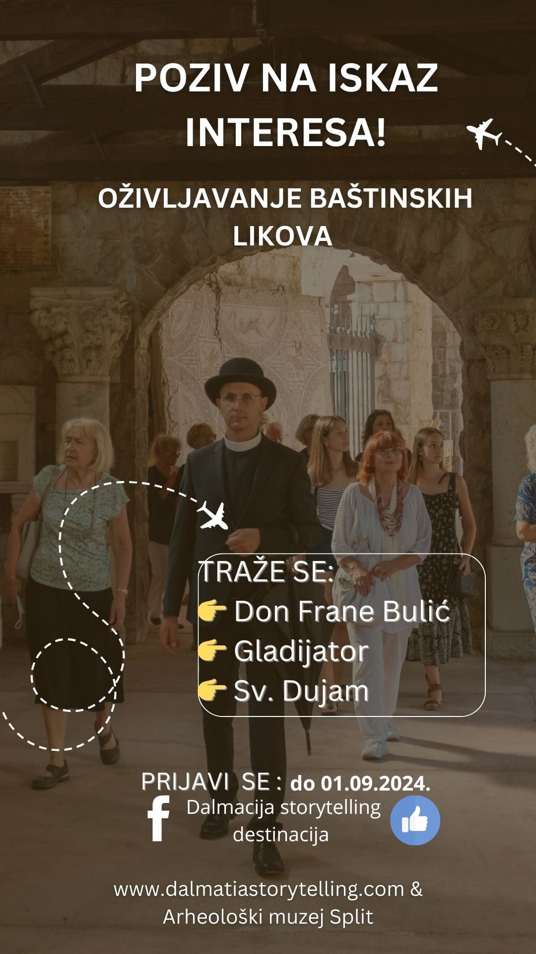 Projekt Dalmacija storytelling destinacija pokreće potragu za kandidatima koji će oživjeti tri značajna baštinska lika – don Frane Bulića, gladijatora i sv. Dujma! Ova jedinstvena inicijativa, organizirana u suradnji s Arheološkim muzejom u Splitu, poziva sve licencirane turističke vodiče iz Splitsko-dalmatinske županije da se uključe u projekt koji će obogatiti kulturnu i turističku ponudu grada Splita i Solina.