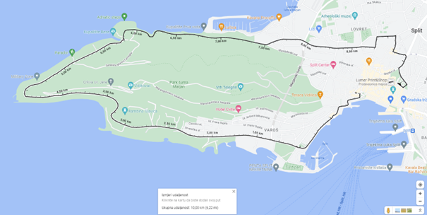 RUTA: Trumbićeva obala, Šetalište Ivana Meštrovića, Šetalište Marina Tartaglie, Ulica Antuna Gustava Matoša, Ulica Jerolima Kavanjina, Ulica Ante Starčevića, Ulica Ivana Gundulića, Ulica Dujma Mikačića, Bihaćka ulica, Livanjska ulica, Sinjska ulica, Zagrebačka ulica, oko Đardina