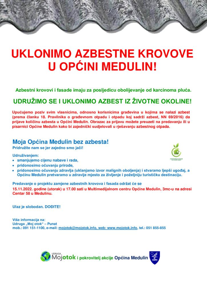 Predavanje pod nazivom “Uklonimo azbestne krovove u općini Medulin!”. će se održati u utorak, 15.11.2022. godine u 17.00 sati u Multimedijalnom centru Općine Medulin, 3mc na adresi Centar 58, Medulin.