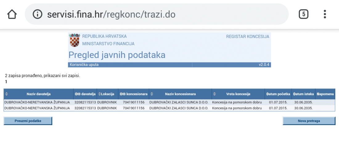 Nije im jasno kako je moguće da se unatoč dvjema pravomoćnim presudama Visokog upravnog suda, koji je prošle godine poništio Rješenja Ministarstva pomorstva, prometa i infrastrukture te Odluku Županijske skupštine Dubrovačko neretvanske županije o odabiru društva Dubrovački zalasci sunca kao najpovoljnijeg ponuditelja za gospodarsko korištenje i uređenje plažno rekreacijskog centra, ta tvrtka i dalje vodi kao legalni koncesionar. Potvrđuje to i uvid u Registar koncesija.