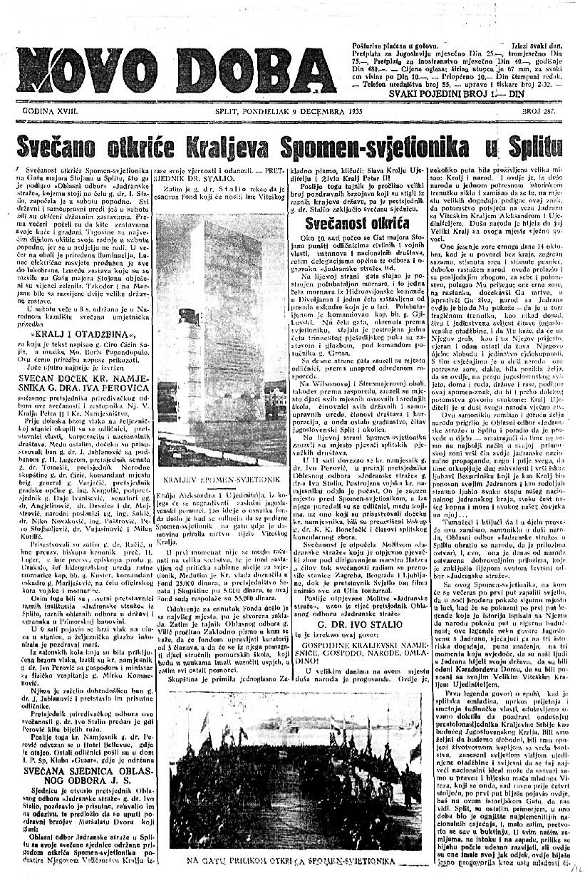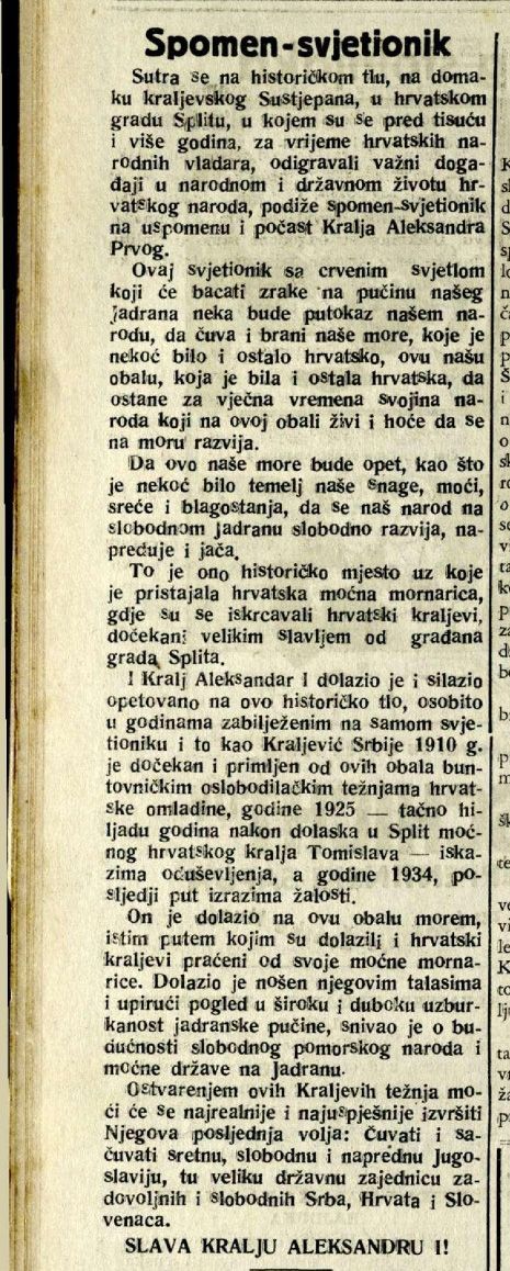 Danas mu nekolicina najčešće nepismenih sugrađana spočitava "Jugoslavenstvo" ili pak "veličanje Srbije" ili "podršku Slobodanu Miloševiću", no ne treba zaboraviti da je to Split. Isti onaj grad koji je 1921. godine podigao spomenik "srpskim osloboditeljima", a ljubav prema srpstvu bila je toliko snažna da je 8. prosinca 1935. godine svečano otkriven i spomen-svjetionik posvećen kralju Aleksandru I., "jedinstven na prostorima čitave zemlje".