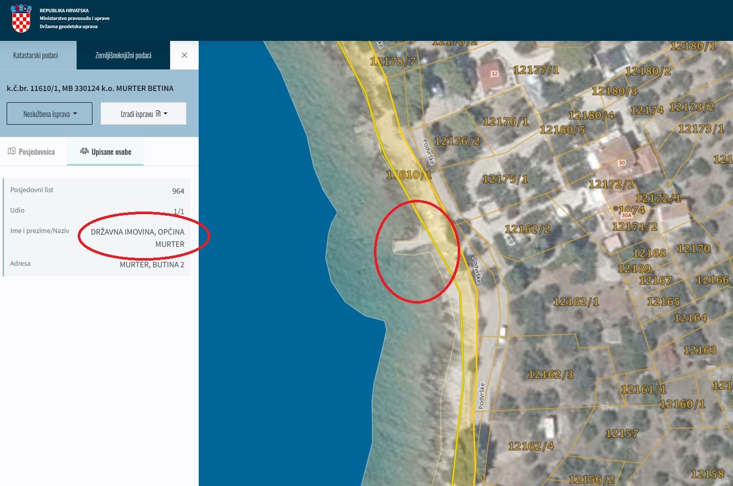 Poziva se i na katastarske čestice, koje uvidom u zemljišno-knjižne podatke naime pokazuju da se između njene čestice i mora nalazi pomorsko dobro, upisano kao "Državna imovina, Općina Murter".