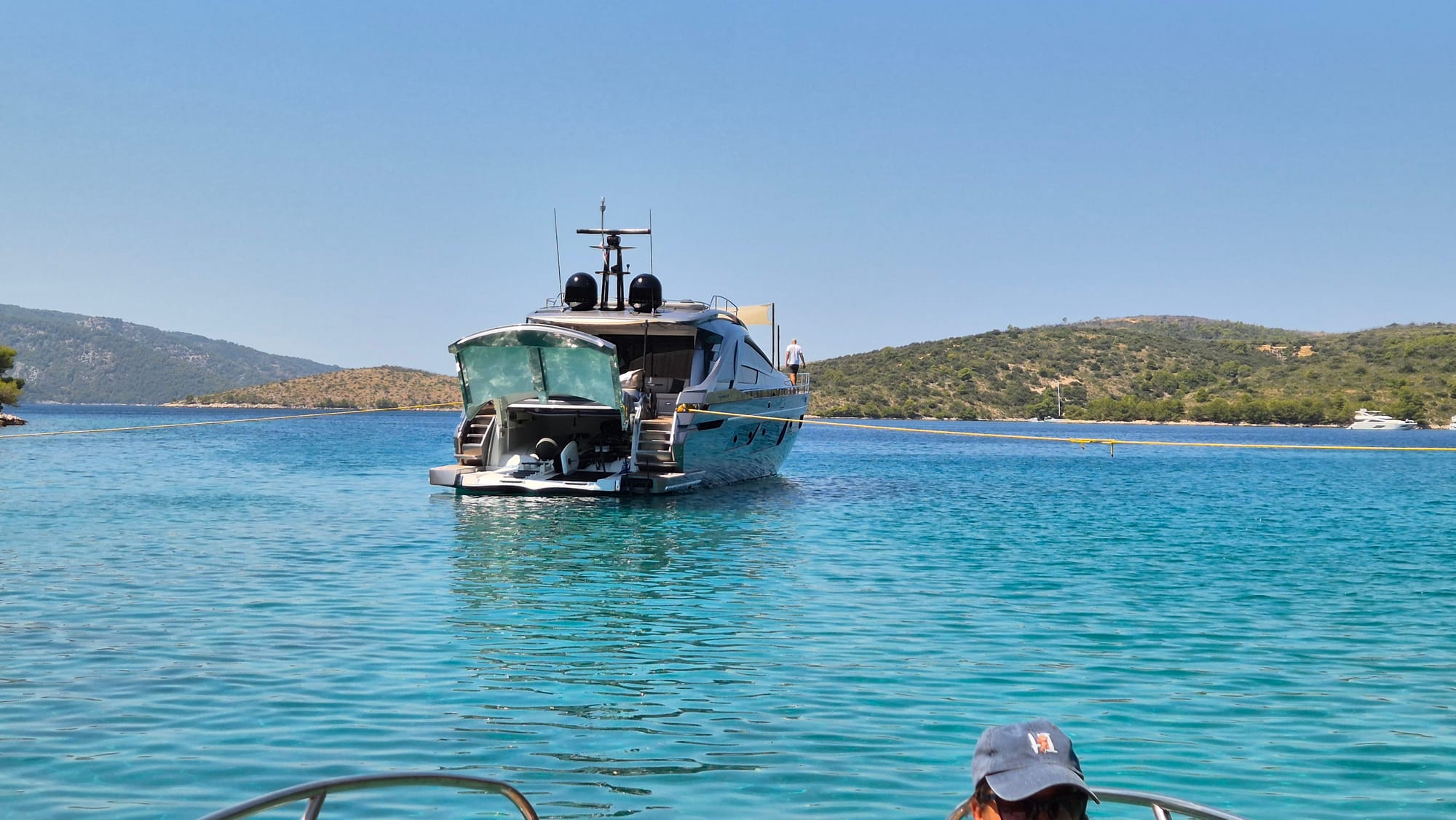 - Evo prvi u uvali Hobonj, Hvar. Privezan je na obje strane uvale, pa smo mi morali ući ispod konopa.