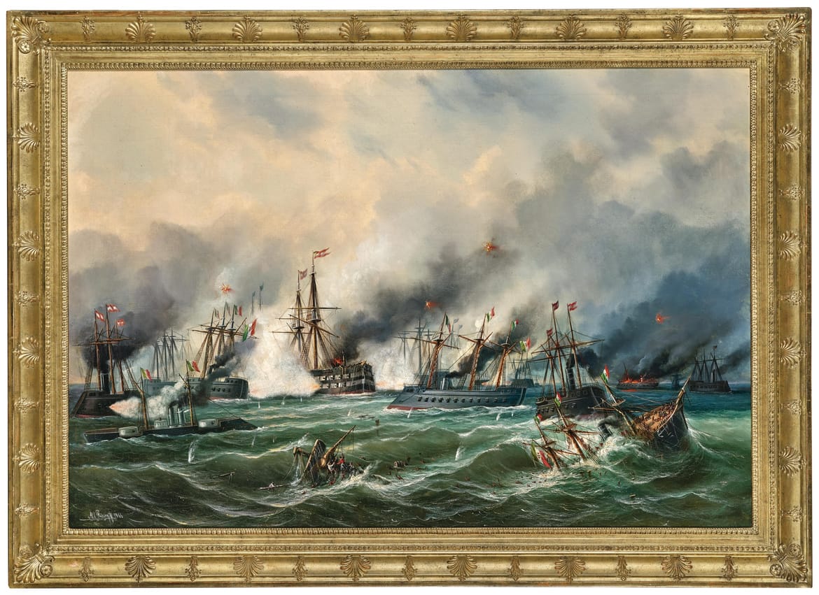 Vrijednosti ove slike pridonosi činjenica da je nastala 1866. godine, iste u kojoj se odigrala slavna bitka između talijanske flote predvođene admiralom Persanom i austrougarske mornarice predvođene admiralom Tegetthoffom. Inspiriran pobjedom Austro-Ugarske nad nadmoćnijim protivnikom, kojom je učvršćena vlast nad Jadranom, Rieger, inače poznat po planinskim i obalnim pejzažima, odlučuje prikazati ovu povijesnu scenu. Igrom svjetla i sjene vješto dočarava dramatičnu atmosferu bitke i nemirno more, prenoseći svoj ponos i emocije na platno koje postaje svjedok vremena i perspektive tadašnjeg društva.