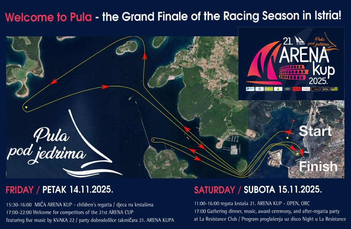 PULA - Od 14. do 16. studenoga 2025. Pula ponovno postaje središte jedriličarskih zbivanja. U pulskoj luci održava se 21. ARENA KUP, tradicionalno grand finale regatne godine krstaša, koje će okupiti jedriličare iz Hrvatske i inozemstva.