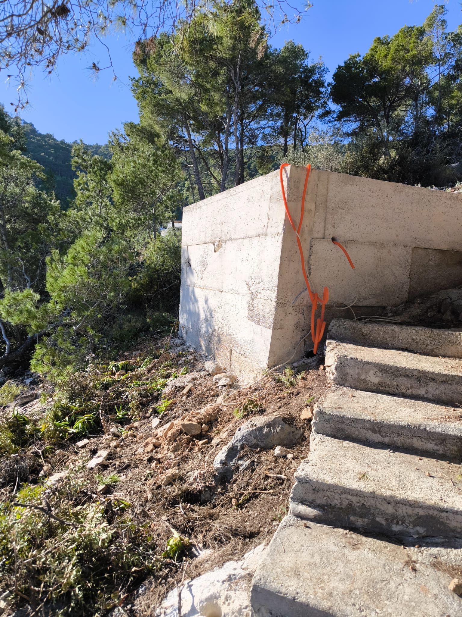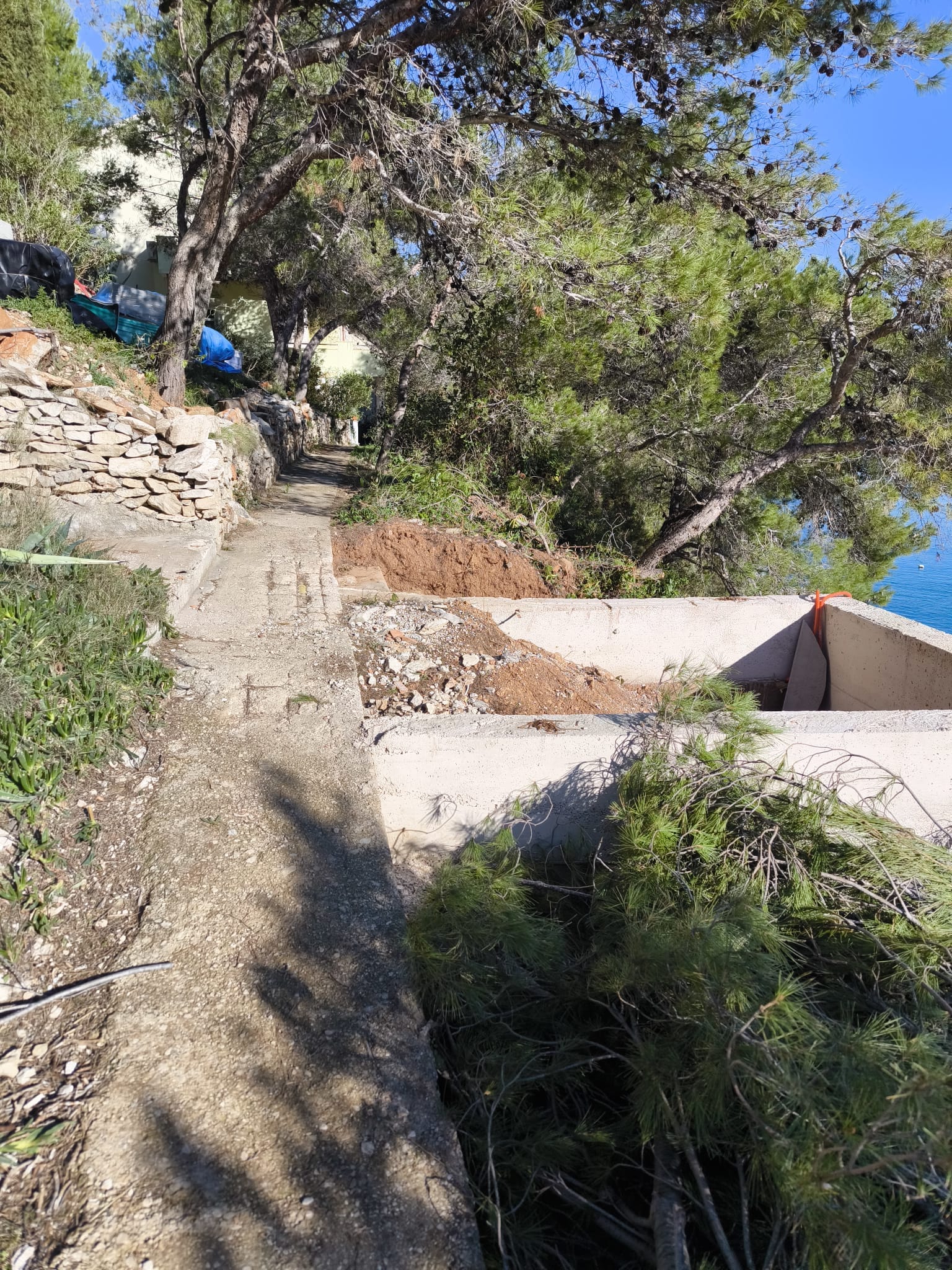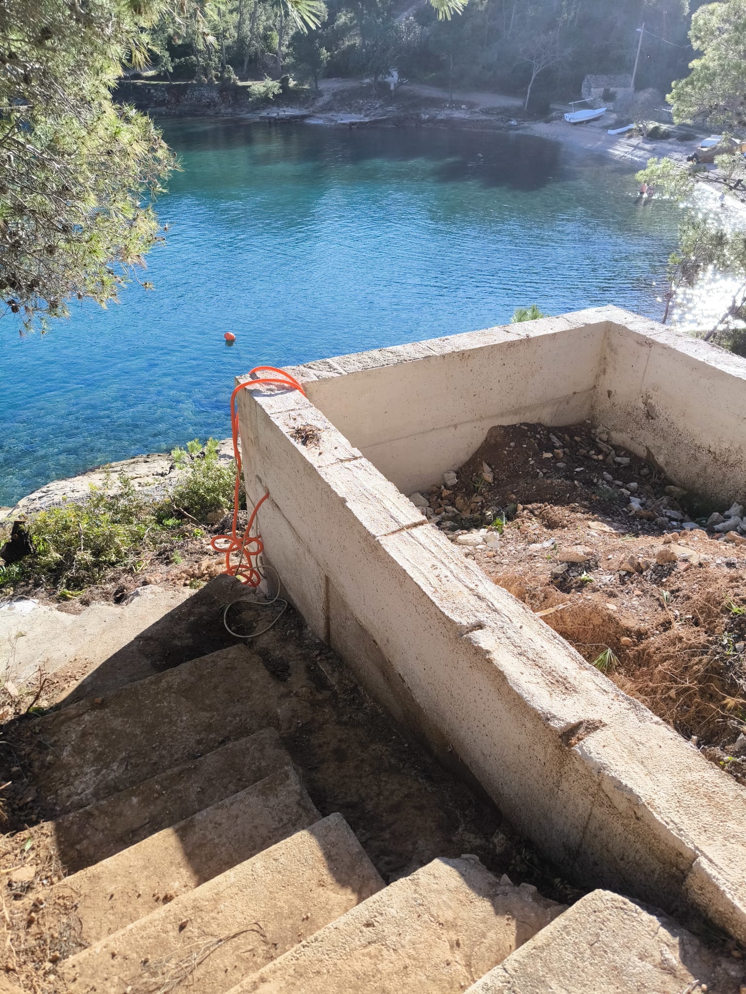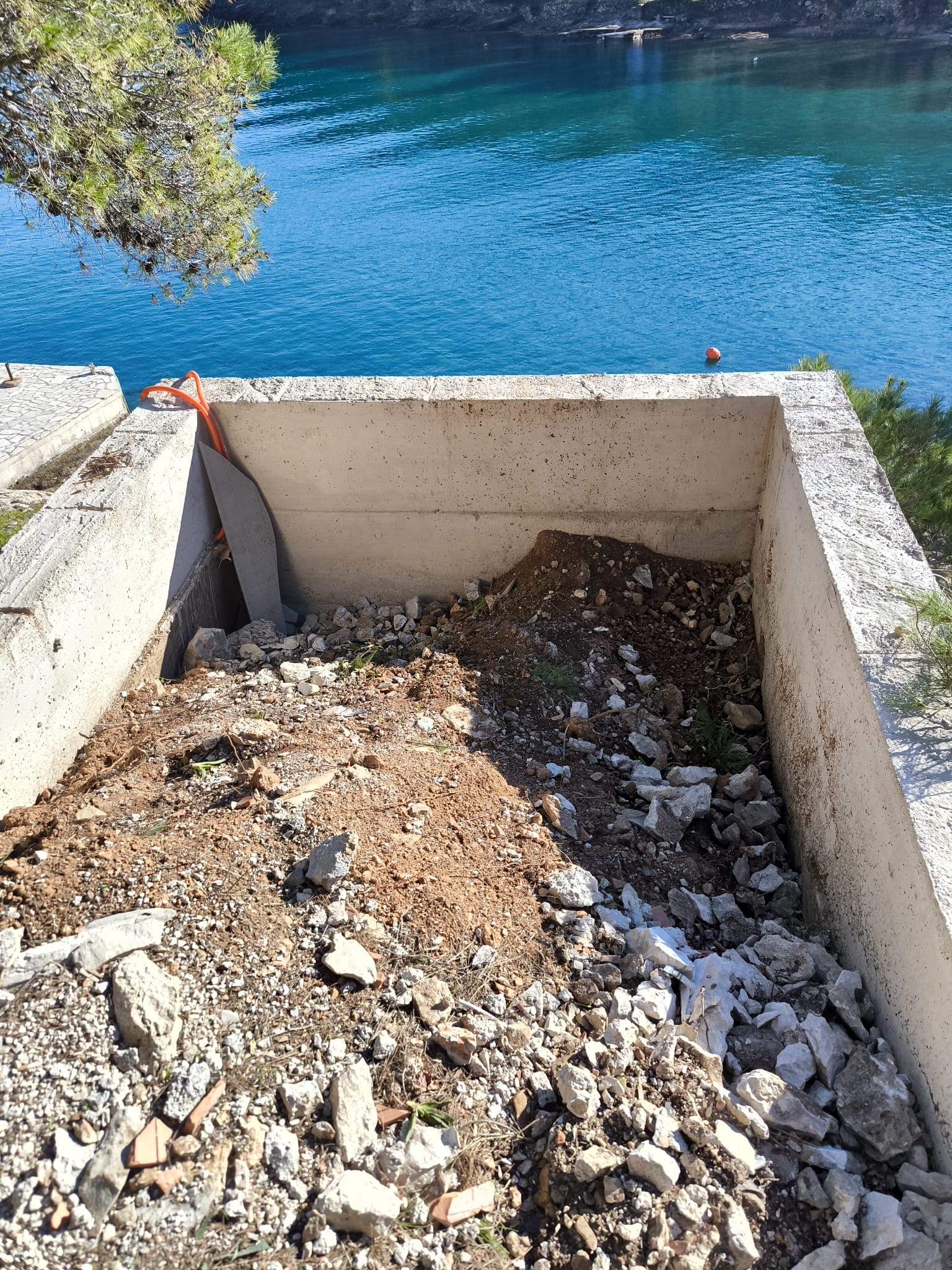 Na samim škrapama, nekih pet metara od mora, dakle na pomorskom dobru netko je odlučio betonirati. Napravljen je komad zida, a s obzirom na to da je primijećen nekakav odvod pretpostavlja se da se planirao napraviti crna jama. No, osim što ovo nije privatno zemljište, već kako navode otočani pomorsko dobro, tu je u neposrednoj blizini i plaža na kojoj ljeta provode djeca, kupaju se svega nekoliko metara dalje.