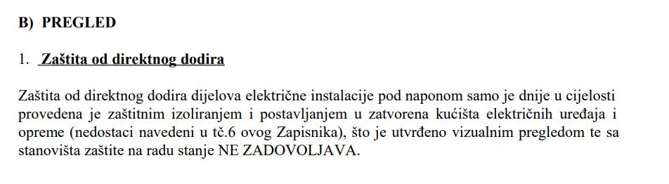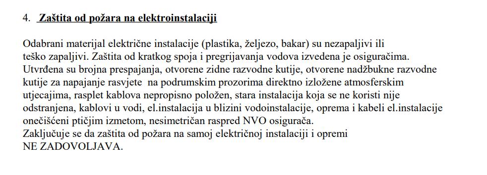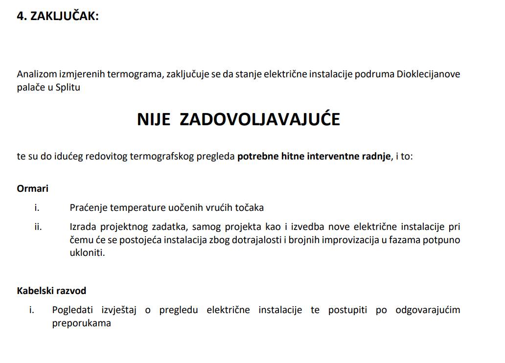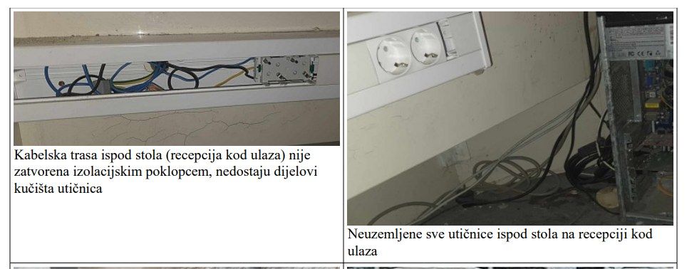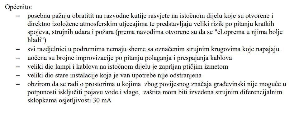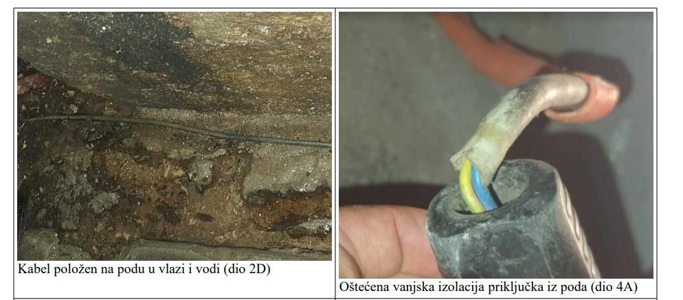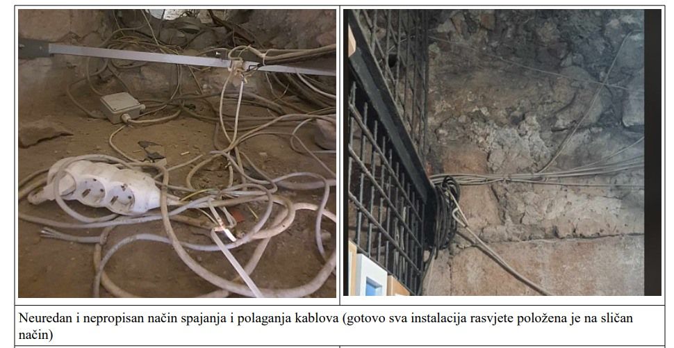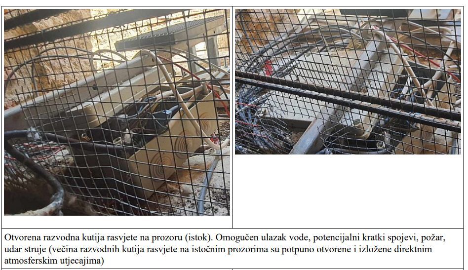 U privitku Vam dostavljam fotografije nekoliko kritičnih točaka (ima ih znatno više). Napominjem da smo tijekom suhog perioda mogli kontrolirati situaciju, zatvarati kritične prostorije (statički ugrožene, prostore u kojima je počela izbijati živa voda), bez opasnosti kontrolirati stanje električnih instalacija na mjestima ugroženosti, mjeriti temperaturu u preopterećenim električnim kutijama i na kritičnim točkama instalacija.