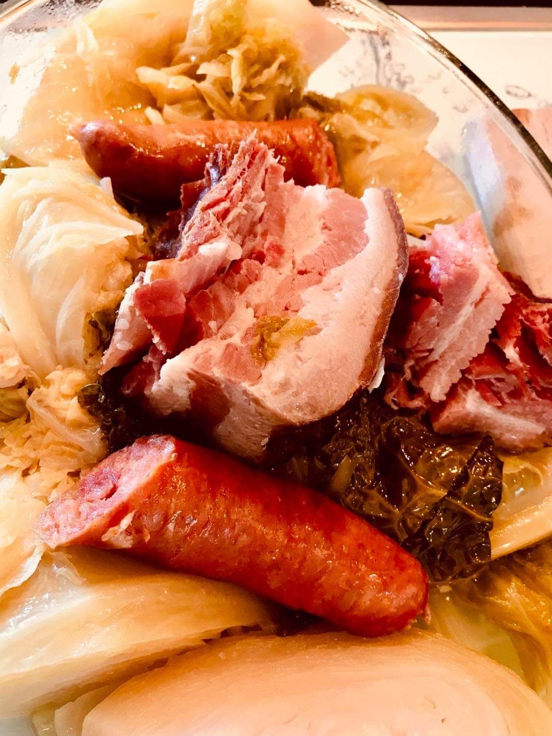 S obzirom da je ovo lagana menestra u koju se ne stavja svinjska glava, nemojte prolijevati prvu vodu nego nakon 40 min dodajte kupus prerezan na četvrtine, polovice patata i kobasice. Za razliku od “prave menestra”, kojoj za kuhanje trebaju 3 ure, ova će biti gotova za 1 uru, kuha se s tri vrste kupusa i u nju ide raštan, ali od namirnica ne stavljamo ništa jako.