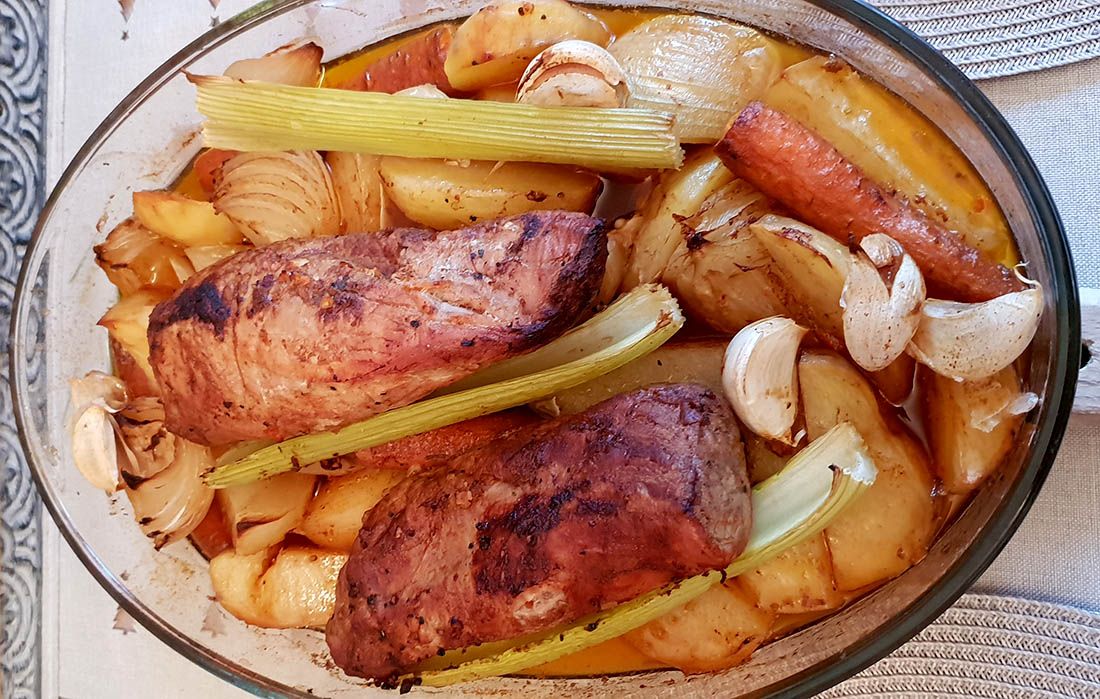 Za pečenje pripremimo ocišćene patate prerezane popola , jednu glavicu luka i 2 do tri mrkve, korjen seleni i nekoliko pica česna kojega ste samo jednostavno ubacili s ostatkom mesa i povrća.