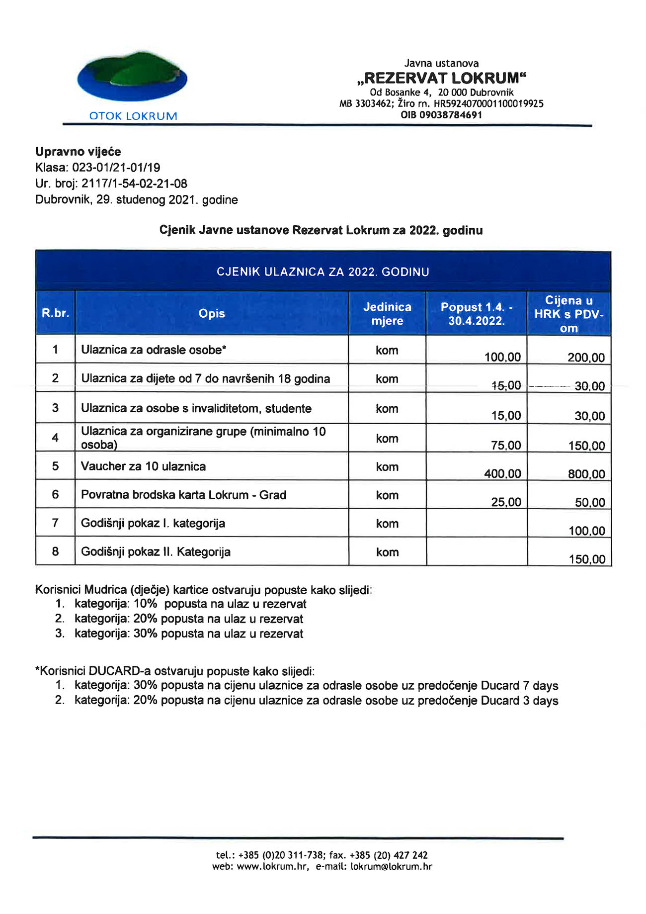 Do 30. travnja 2022. godine odobren je popust od 50% na cijene ulaznica, zakupa i usluga Javne ustanove Rezervat Lokrum.