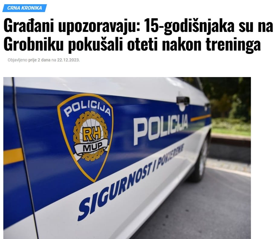 Policija je danas u potpunosti demantirala navode u kojima stoji da se 15-godišnjak vraćao kući s treninga iz lokalnog kluba, kada su naišla dvojica migranata, koji su ga kao htjeli prisiliti da uđe u vozilo, no dječak je udario jednog od njih i pobjegao kući. Roditeljima je ispričao što se dogodilo, pa dok je policija reagirala, u potragu su se bacili građani te pripadnici riječke navijačke skupine Armada koji su, tobože zajedničkim snagama pronašli počinitelje i predali ih policiji. Policija je službeno kazala da je sve ovo najobičnija laž!