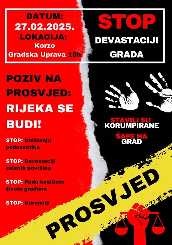 U našu redakciju stigao je poziv na prosvjed pod nazivom "Rijeka se budi!". Prosvjed bi se trebao održati 27. veljače u 10 sati, ispred ulaza u Gradsku upravu, na adresi Korzo 16.