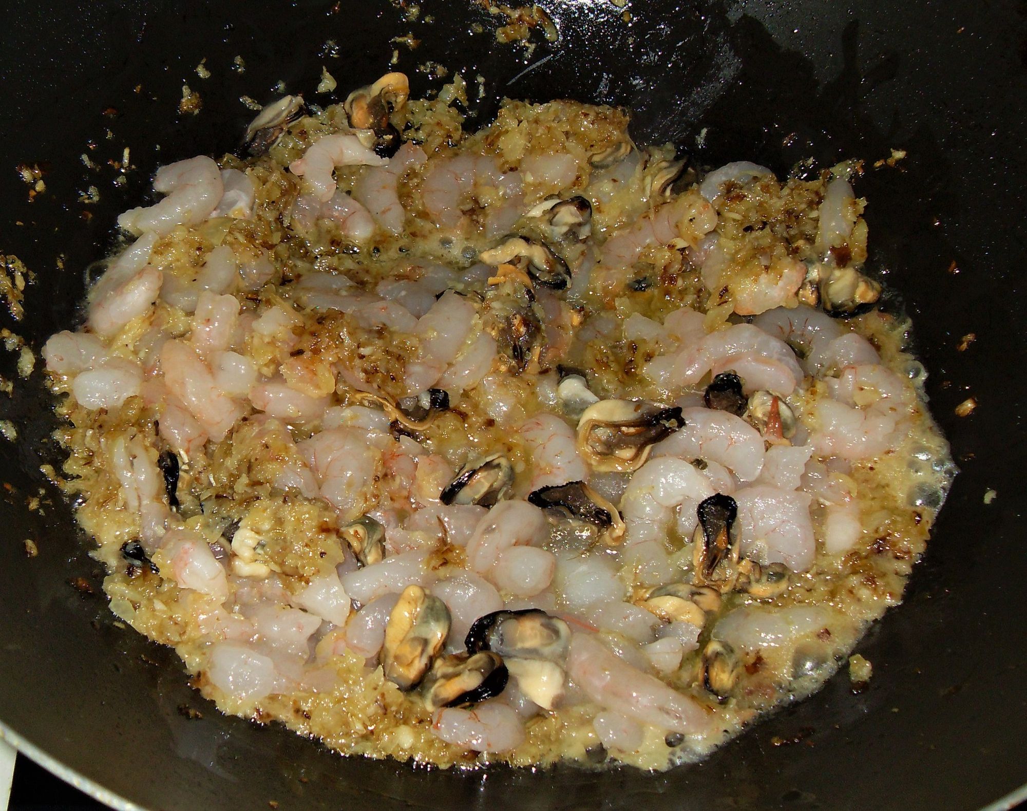 U plitkom loncu zagrijte domaće maslinovo ulje, ubacite sitno sjeckanu kapulu na kockice i dinstajte, kad se zažuti dodajte sjeckani češnjak (4-5 režnjeva). Nakon toga dodajte očišćene repove kozica i meso školjaka te dinstajte desetak minuta na laganoj vatri, zatim ulijte 1 do 2 dl bijelog vina i riblji temeljac (juhu) te pustite da zakuha.