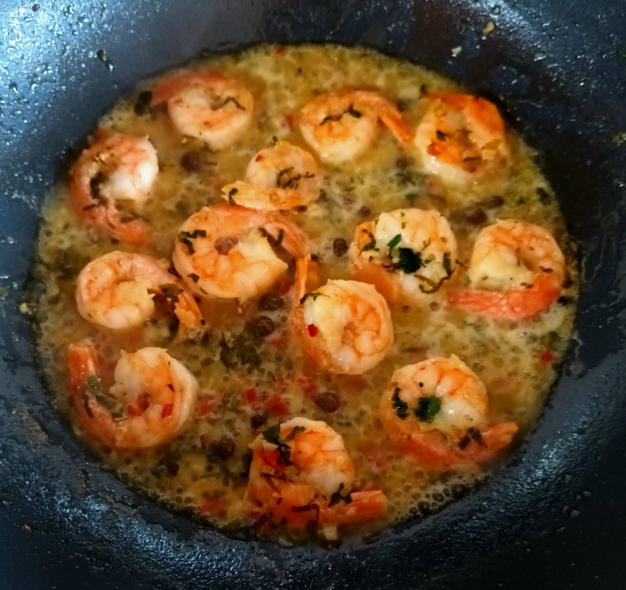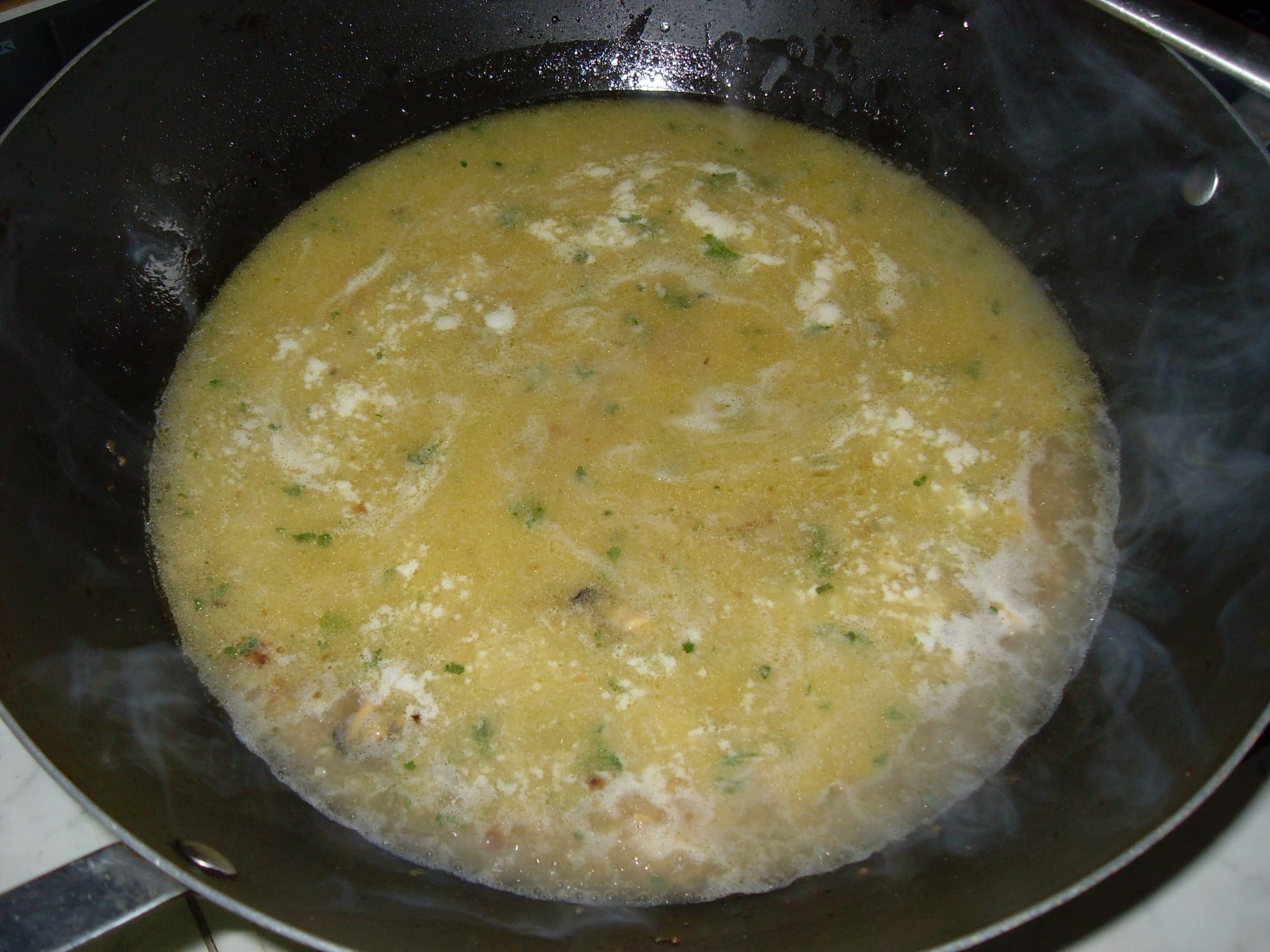 Nakon toga dodajte očišćene repove kozica i narezane šampinjone te dinstajte desetak minuta na laganoj vatri, zatim ulijte 1 do 2 dl bijelog vina i riblji temeljac (juhu) te pustite da zakuha.