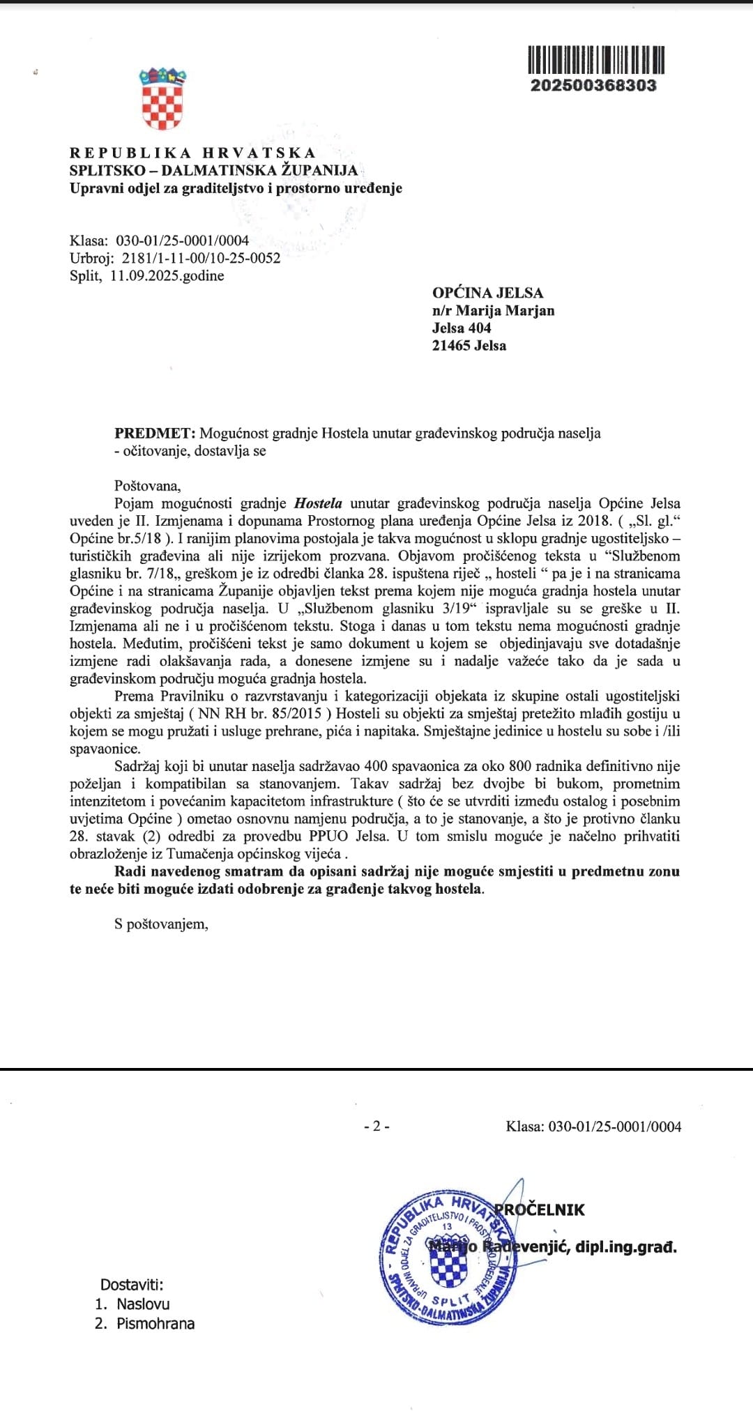 Dakle, jučer sam, kao Načelnica, uputila zahtjev najvišem tijelu u Županiji koje izdaje građevinske dozvole – Uredu za graditeljstvo, odnosno pročelniku Mariju Radvedenjiću – uz prateće dokumente usvojene na vijeću, s molbom da izda mišljenje može li se, temeljem navedene odluke Općinskog vijeća, izdati građevinska dozvola za predmetni hostel.P onavljam: potvrđena je pravna snaga dokumenta kojim se utvrđuje da se NE MOŽE izdati građevinska dozvola za predmetni hostel - poručuje načelnica Jelse, Marija Marjan.