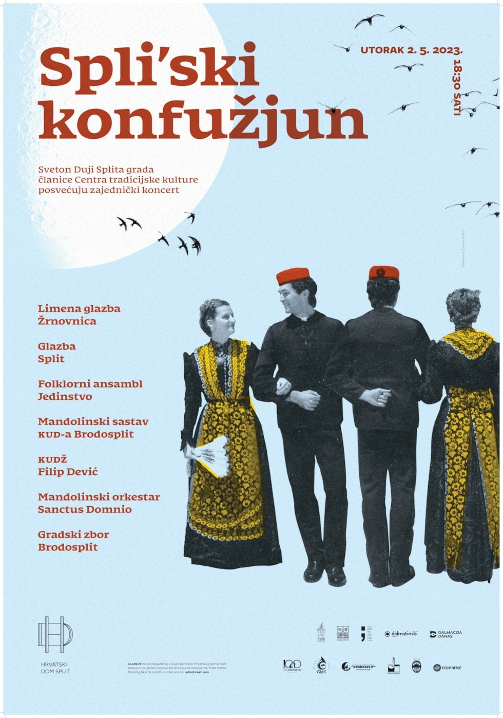 Budite i vi svjedok povijesnog trenutka kad će se s namjerom trajnog očuvanja kulturno-umjetničkog amaterizma u gradu Splitu, najtrofejnija, pa i najdugovječnija splitska društva koja danas okupljaju više od 700 članova, a s više od 200 nastupa godišnje, predstaviti u zajedničkom programu 2. svibnja 2023. naslovljenom 'Spli'ski konfužjun', pozivaju iz Hrvatskog doma Split.