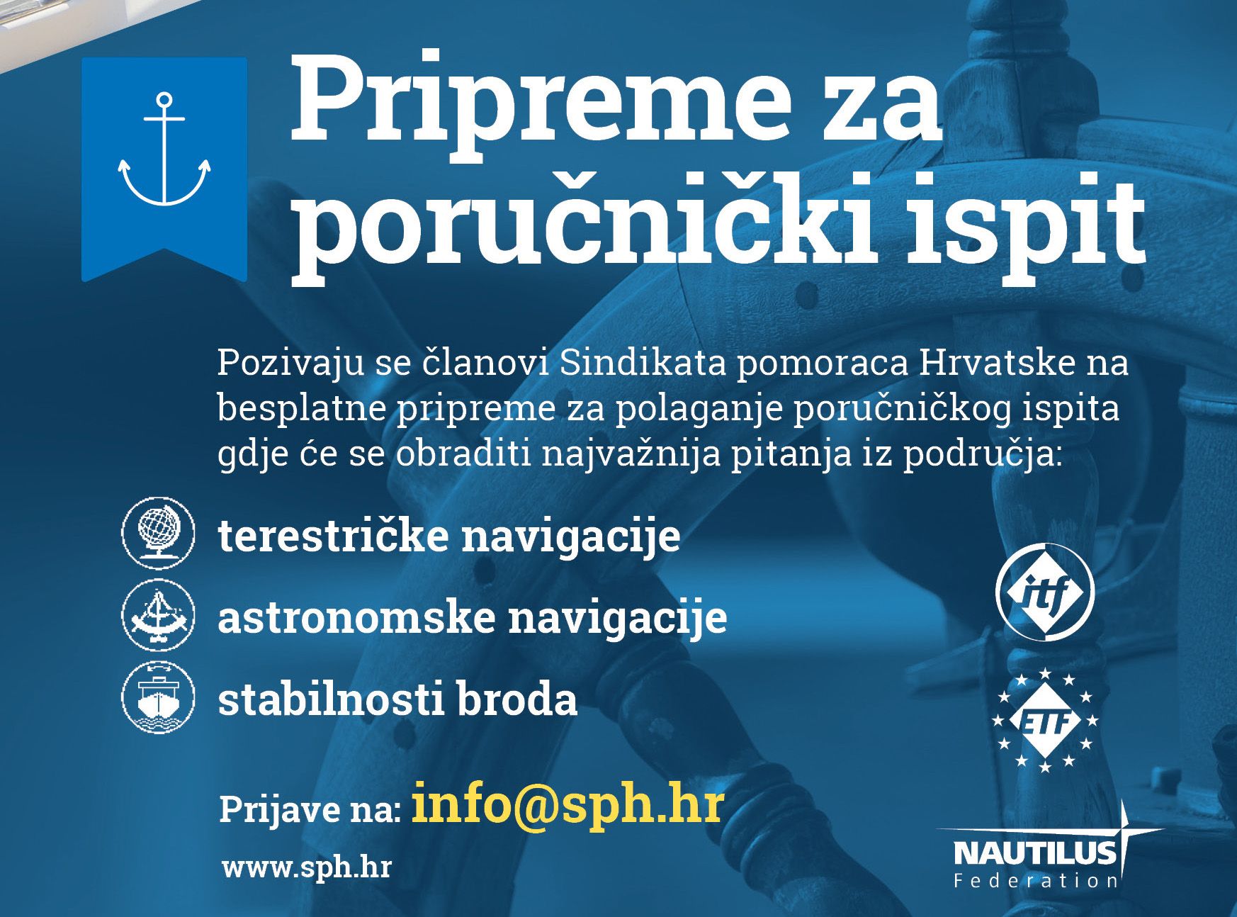 Sindikat pomoraca Hrvatske organizira pripreme za "poručnički ispit", koje će biti održane od 16. do 18. siječnja u Rijeci (Krešimirova 4).