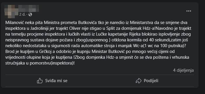 Prenosimo i komentar s društvenih mreža o navodnim razlozima neisplovljavanja Olivera, te smjenama inspektora u Jadroliniji kojeg, do zaključenja ovog članka nismo mogli potvrditi. O ovome smo poslali upit u Jadroliniju i odgovor ćemo objaviti čim ga dobijemo. Podsjetimo, odgovor o pravim razlozima i tehničkim problemima zbog kojih Oliver još nije zaplovio, još nismo dobili, a upit smo Ministarstvu mora poslali prije tri dana.