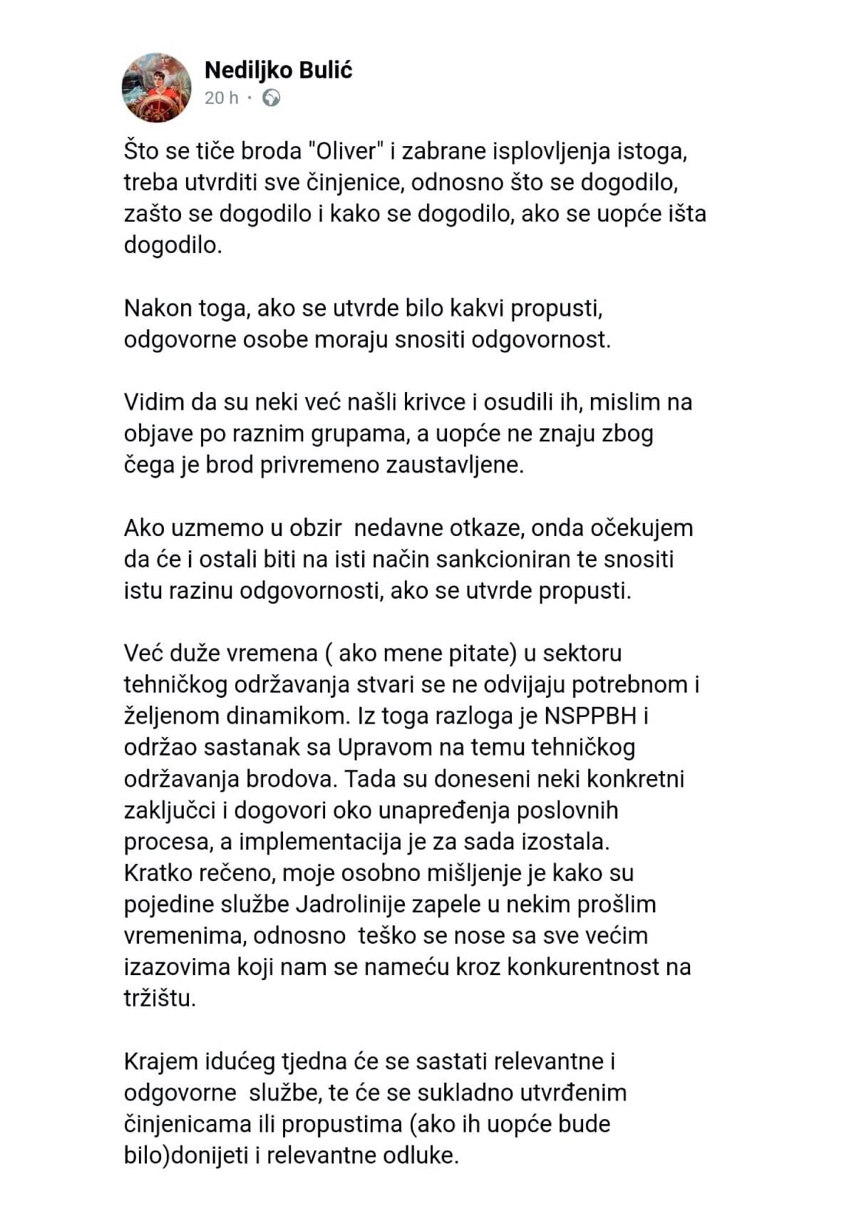 - Oliver je definitivno točka na "i". Sama ta činjenica da je ovaj brod 4 mjeseca u škveru umjesto da održava liniju, dovoljna je. Pa brod je od 11. prosinca u remontnom brodogradilištu, a prije toga je bio u Grčkoj nekoliko dana. Nije se apsolutno ništa napravilo! - kazao je za Morski HR Ivan Srzentić, predsjednik strukovnog sindikata Jadrolinije, a u prilogu je objavljena i objava radnika, predstavnika radnika iz tehničke službe u Nadzornom odboru, Nediljka Bulića koji spominje i nedavne otkaze u Jadroliniji.