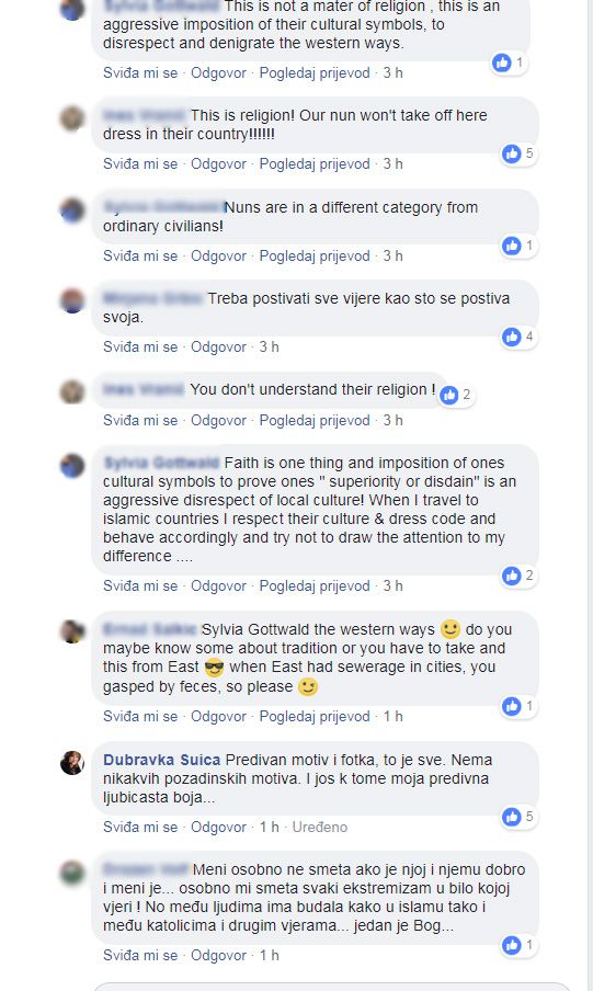 “Bože dragi zar u 21. stoljeću nismo dovoljno kulturni i odgojeni da poštivamo nečiju vjeru? Kako bi se osjećali da ovakve komentare čitate ispod slike jedne časne sestre? Užas!!! Gospođo Šuica poštovala sam Vas sve do ove objave, zaista je nepojmljivo da ste za Instabulsku konvenciju za zaštitu žena a javno se sprdate s jednom ženom koja živi u svojoj vjeri koliko god drugima bila neshvatljiva! Postujmo druge kao sebe!!!!”