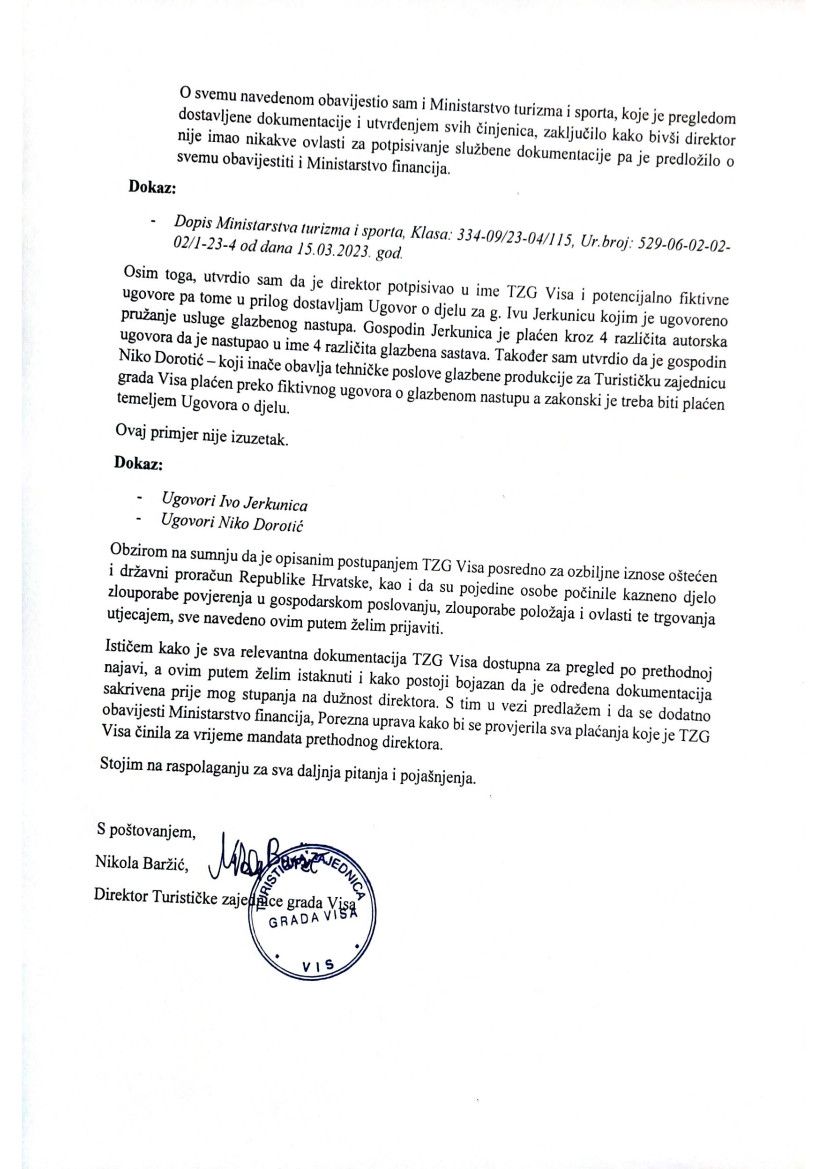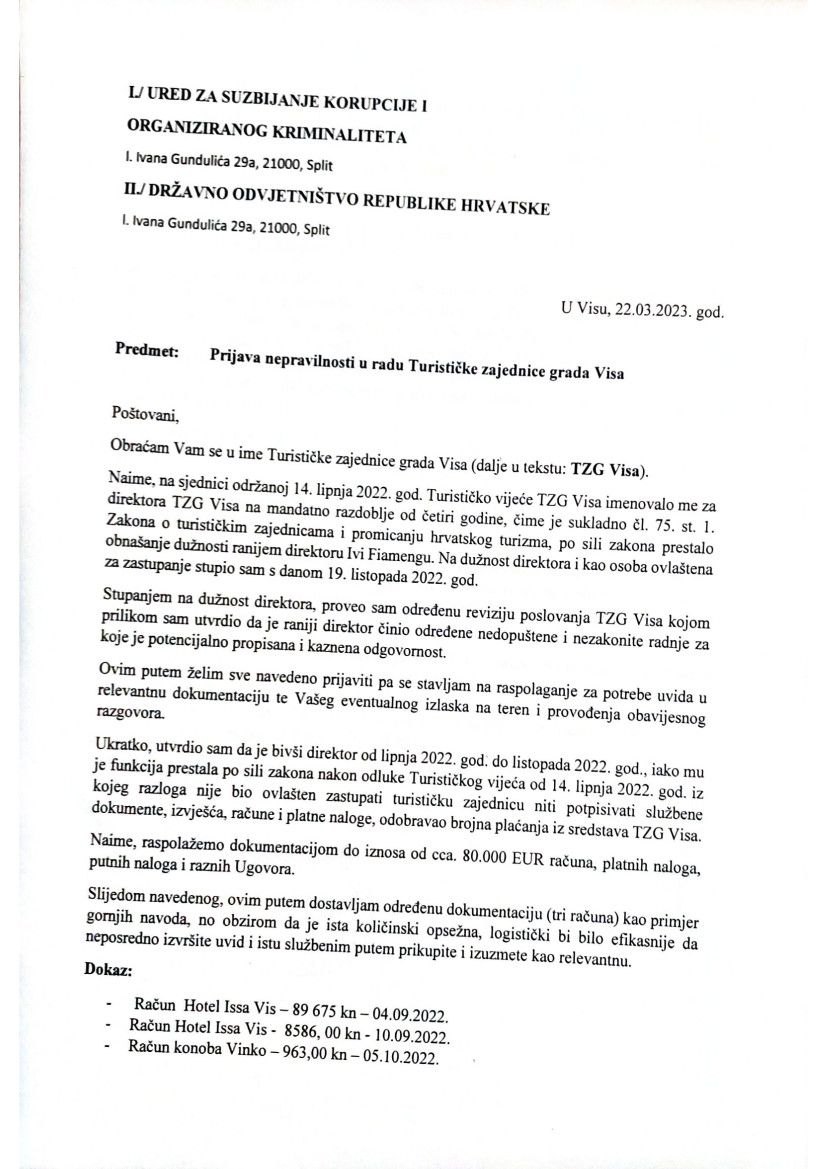 Slijedom navedenog, ovim putem dostavljam određenu dokumentaciju (tri računa) kao primjer gornjih navoda, no obzirom da je ista količinski opsežna, logistički bi bilo efikasnije da neposredno izvršite uvid u istu i službenim putem prikupite i izuzmete kao relevantnu", stoji između ostalog u prijavi gdje izdvaja račune za hotel Issa Vis i konobu Vinko, koje je, kako kaže, potpisivao bivši direktor kad to više nije smio, a napominje da je potpisivao i potencijalno fiktivne ugovore