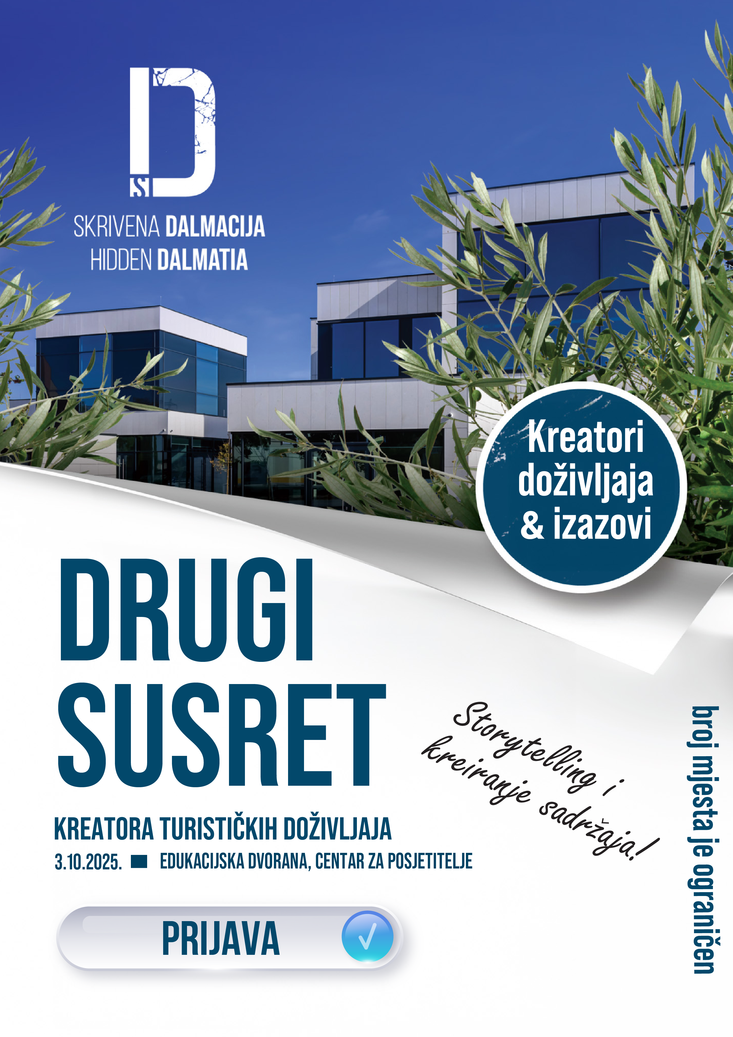 Splitsko-dalmatinska županija poziva sve kreatore turističkih doživljaja na drugi susret pod nazivom "Skrivena Dalmacija", koji će se održati u petak, 3. listopada 2025. u Edukacijskoj dvorani Centra za posjetitelje "Skrivena Dalmacija" u Dugopolju.