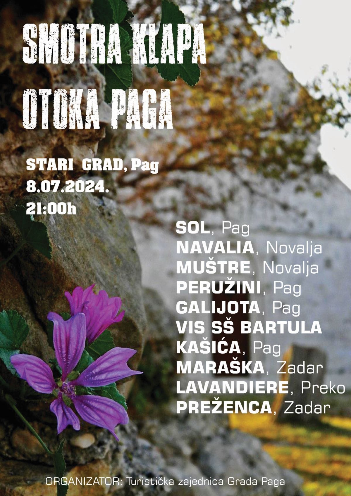 Ovogodišnja smotra održat će se na novoj lokaciji u Starom gradu u Pagu, a posjetitelji će uživati u predivnom ambijentu i klapskim pjesmama koje će izvoditi klapa Sol, Galijota i Peružini iz Paga, Navalia i Muštre iz Novalje. Na ovogodišnjoj smotri po prvi puta nastupit će i klapa Vis Srednje škole Bartula Kašića iz Paga, Lavandiere iz Preka te Maraška i Preženca iz Zadra.