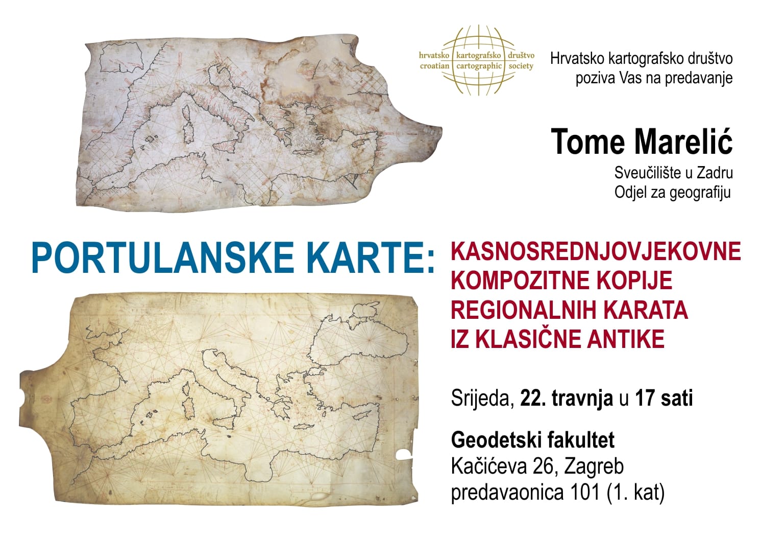 Hrvatsko kartografsko društvo organizira javno predavanje o starim pomorskim kartama iz kasnog srednjeg vijeka (tzv. portulanskim kartama) koje će se održati u srijedu 22. travnja u 17 sati na Geodetskom fakultetu u Zagrebu u predavaonici 101 (1. kat), Kačićeva 26.